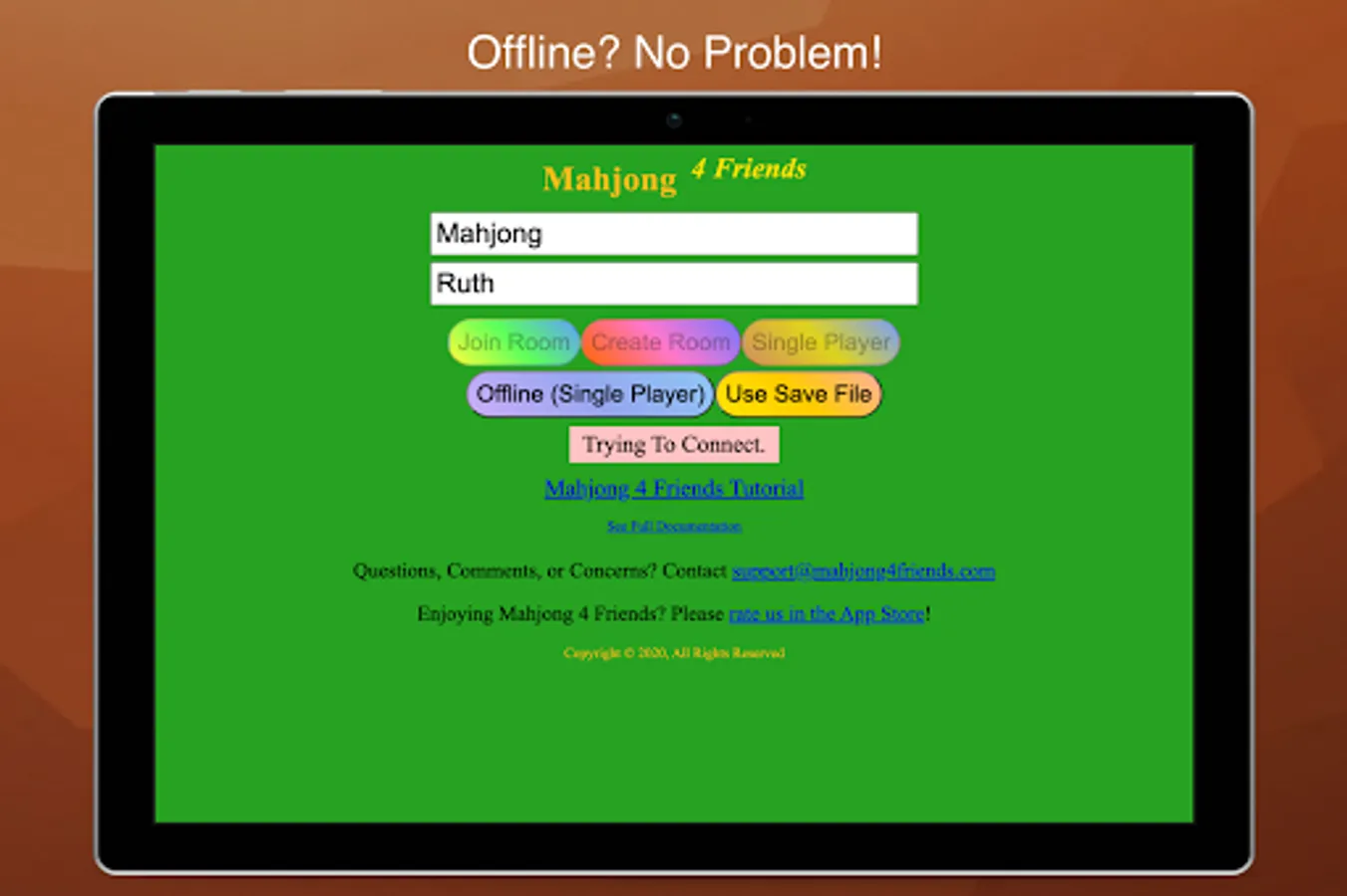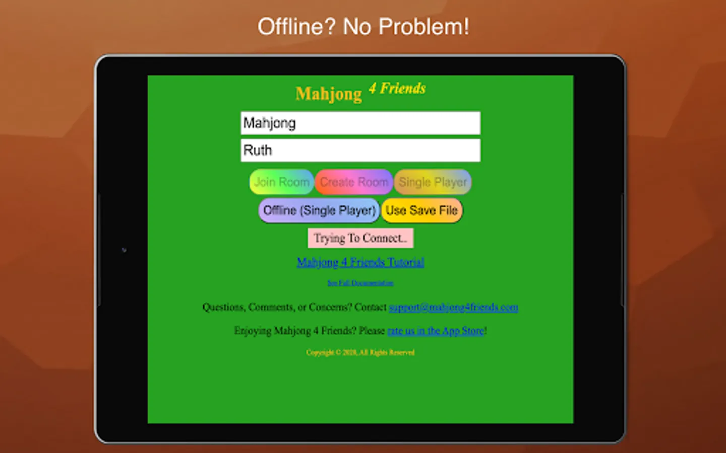 It can be difficult to diagnose issues from the limited information in reviews! Please contact support@mahjong4friends.com if you encounter issues or need assistance. Response times vary heavily, but we usually respond within 24 hours.