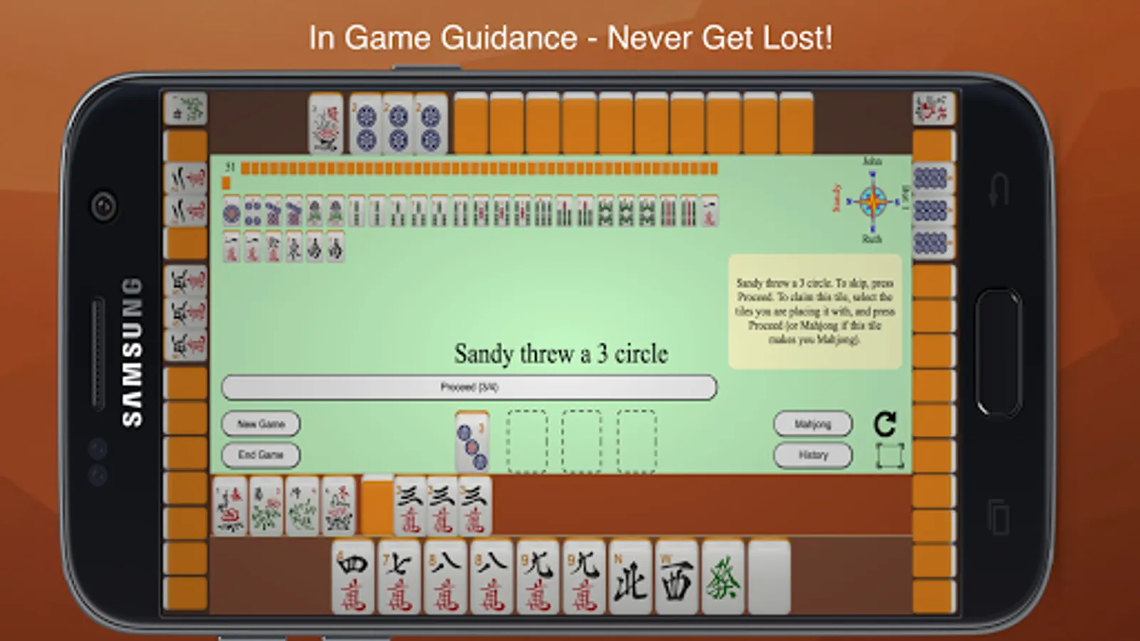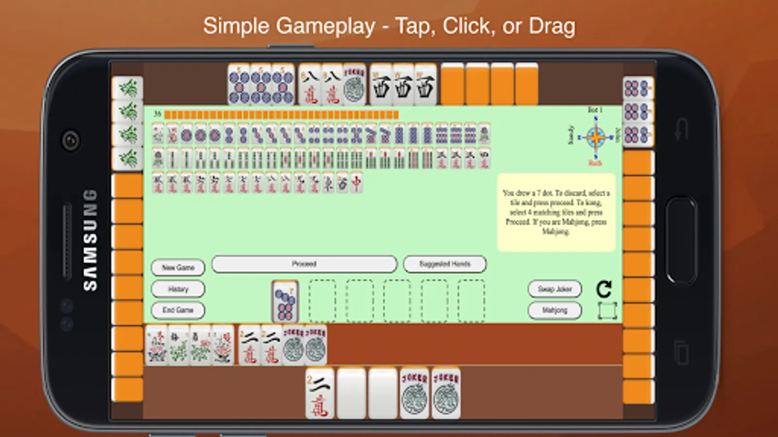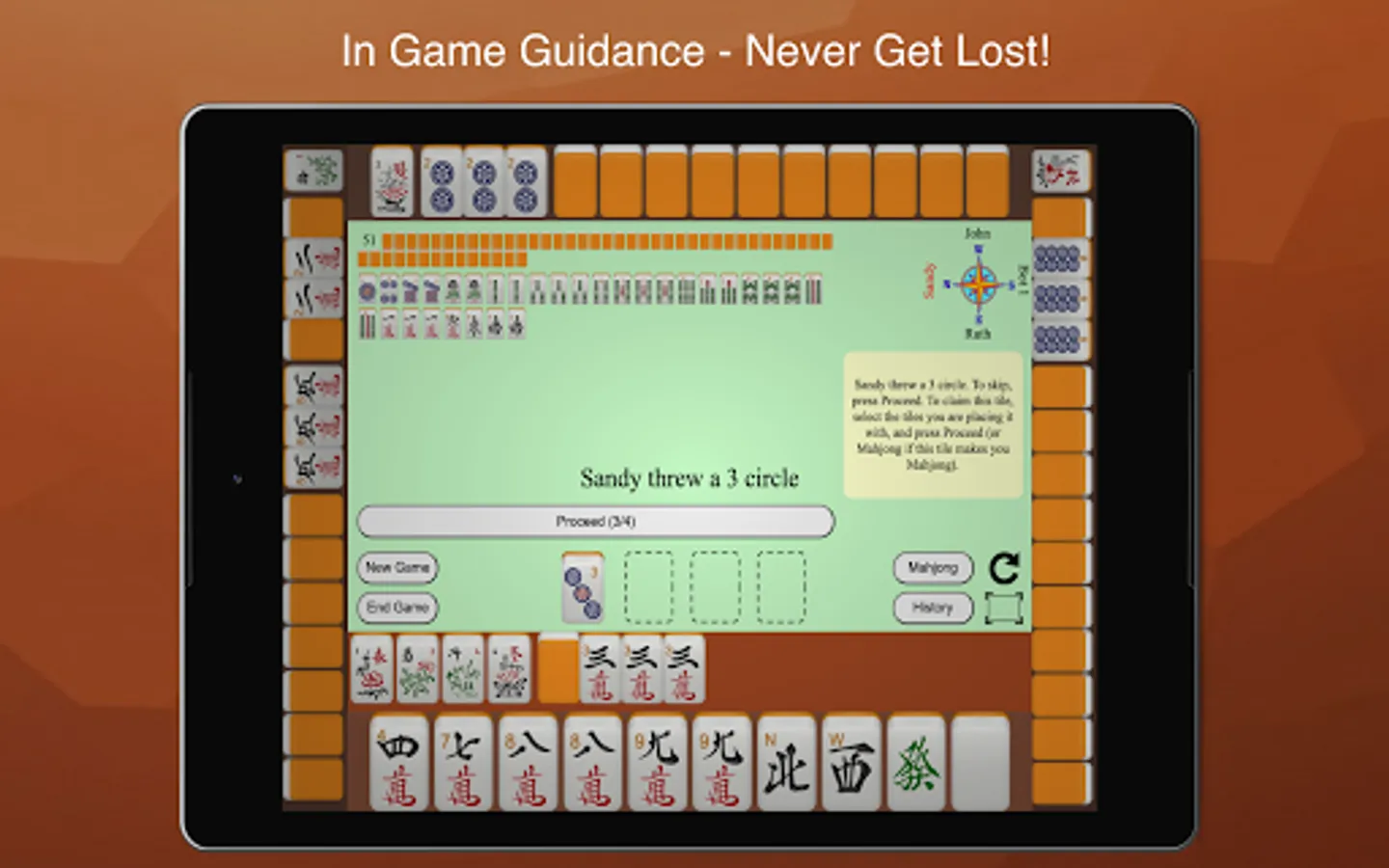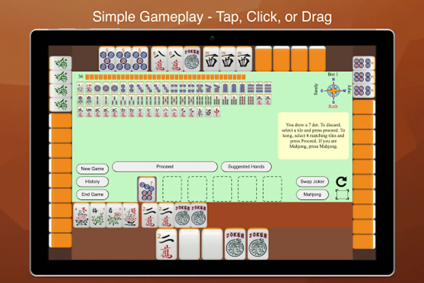 Mahjong 4 Friends provides instructions in little yellow bubbles while in the game. If you want to learn more about rules and strategies, a comprehensive tutorial is linked to from the app. Summaries of rules are provided below: