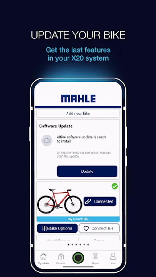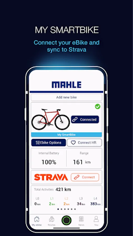 New App My SmartBike, by MAHLE, provides you an enhanced e-bike riding experience by using your smartphone as the interface to your bicycle. Our application is designed to help tune, customize e-bike performance and enjoy your trips. Connect with your e-bike and adjust your preferences, customize motor maps to adapt the MAHLE SmartBike System to your personal necessities, remaining batteries, record your activities, have access to statistics, see bike location and more.