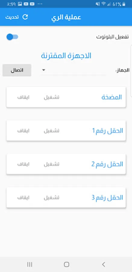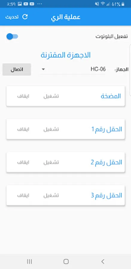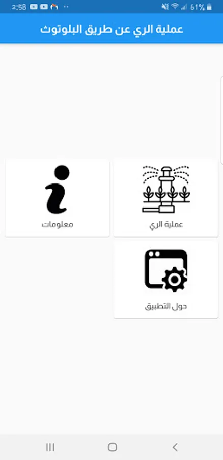 It allows the user to control the irrigation pump and water the fields by using the Arduino via Bluetooth.