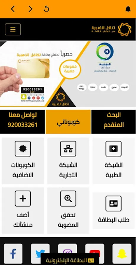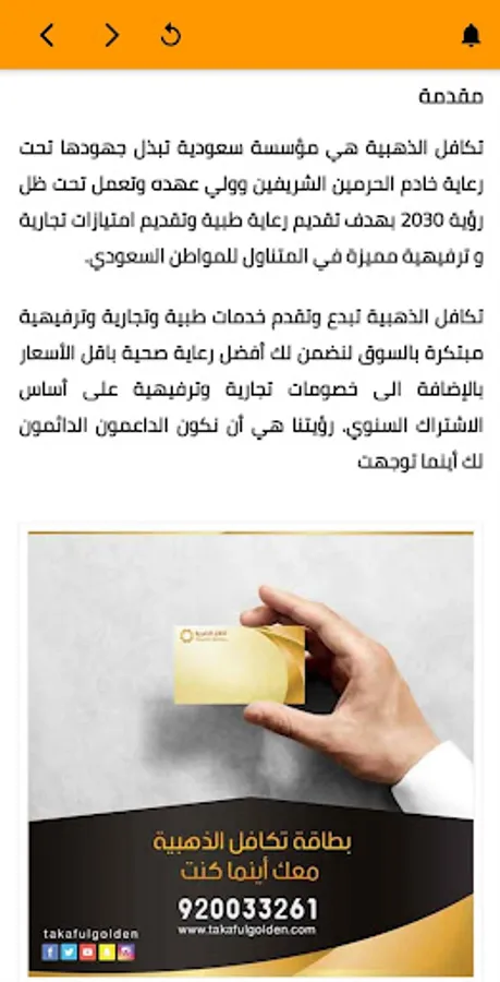 And because we are keen to provide the best advanced services that will serve the Golden Takaful customer wherever he is, we have created this application through which our customers will be able to identify our renewable services and know the best and strongest offers and discounts that we have provided to him, which include all service sectors in the Kingdom of Saudi Arabia.