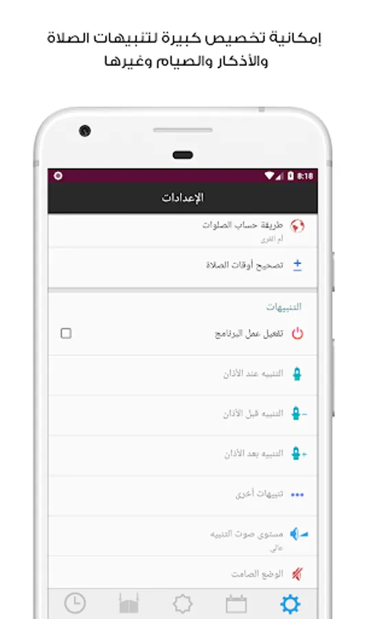 إمكانية تخصيص كبيرة لتنبيهات قبل وأثناء وبعد الأذان ومنبه الفجر والأذكار وغيرها. عرض المساجد القريبة و تحديد أقرب مسجد لك