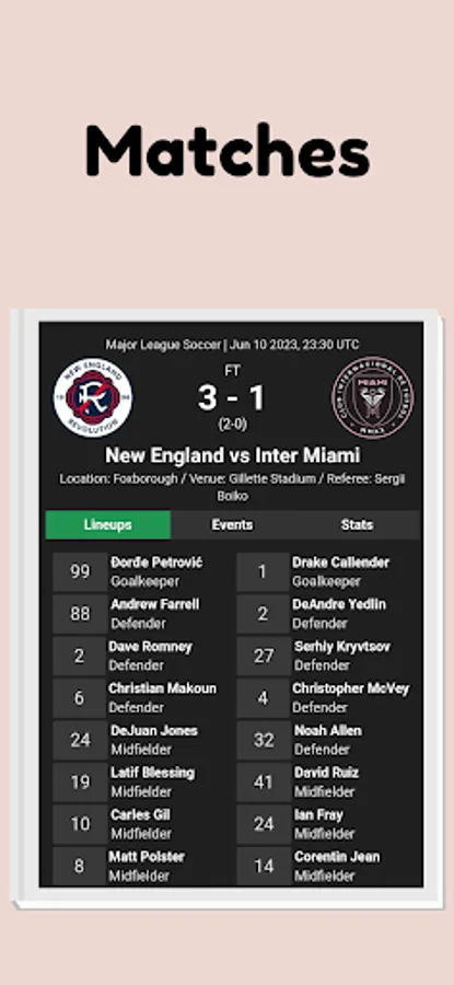 1- Match Results and Fixtures: Get instant access to the latest match results of Inter Miami , ensuring you never miss a beat. Stay informed about the team's performance and track their progress throughout the season. Browse upcoming fixtures to plan your soccer-watching schedule in advance.
