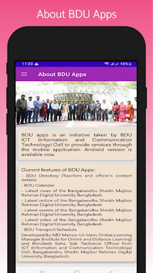 BDU Apps are developed by the skilled team at the BDU ICT (Information and Communication Technology) Cell team members are MD. Mahsin-Ul-Islam, Online Learning Manager from IODL(Institute for Online and Distance Learning) and Bimolesh Saha, Sub Technical Officer from ICT Cell of BDU, ensuring a user-friendly experience and optimal functionality.