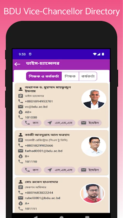 Stay connected with the BDU Directory, featuring detailed contact information of teachers and officers, including designation, email, phone numbers, and even blood group details for emergencies.
