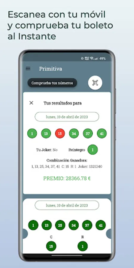 In summary, our application is the perfect tool for those who want to be up to date with the results of the primitiva, bonoloto and euromillions draws. With the ticket scanning option, you can check your results quickly and easily. Download our lottery checker app now and start winning great prizes. It's free!