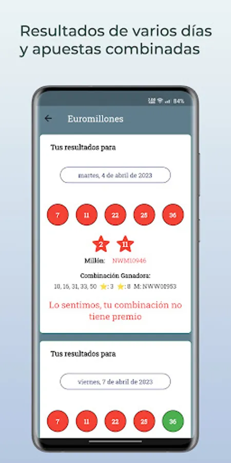 With our application, you will have access to the latest results of the primitiva, bonoloto and euromillions draws in real time. You will be able to see the winning numbers of each draw and the corresponding prizes. This way, you will never miss the results of your favorite draws.
