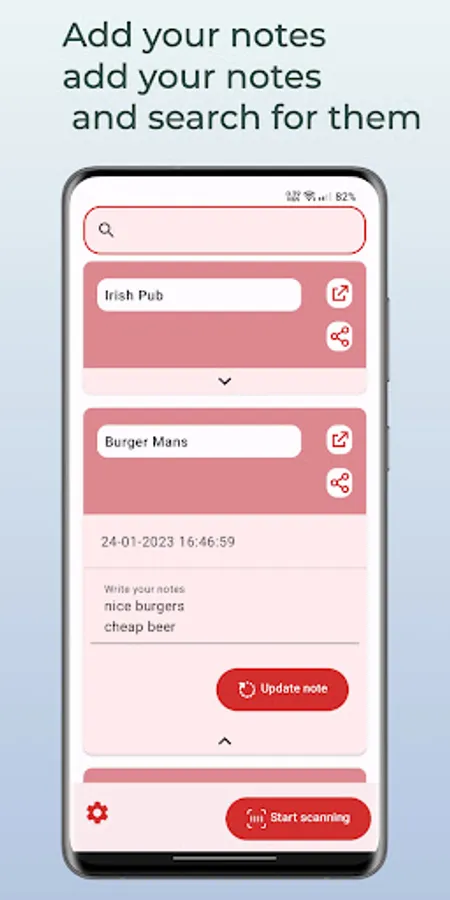With our barcode scanning app, you can easily scan the barcodes of your favorite bar menus and store them in one place for quick and easy access. Additionally, our app allows you to search for your bar menus by bar name or by notes you've added, making it easy to find the menu you're looking for at any time.