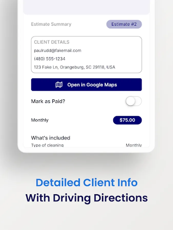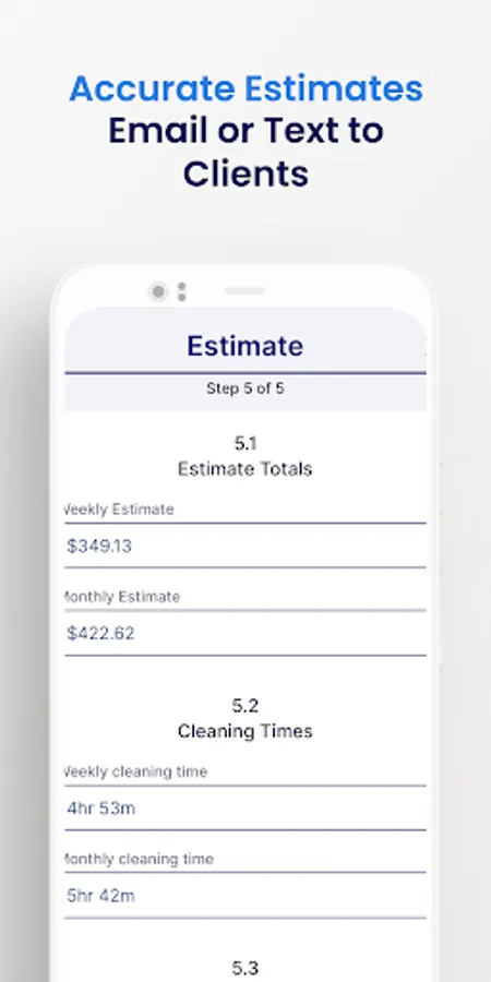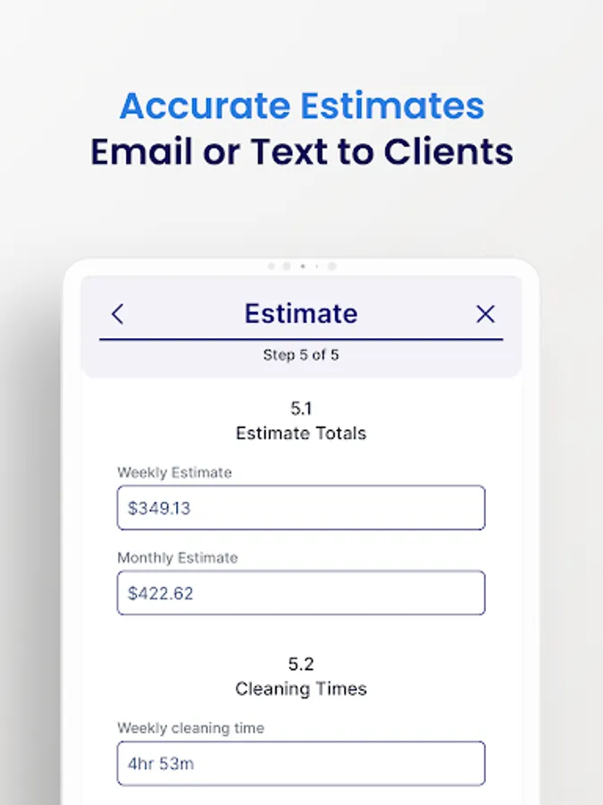 Accurate Estimates: Generate precise and professional quotes for new clients in minutes. Our advanced algorithm considers factors like house size, cleaning frequency, and special requirements to provide you with a customized estimate that your clients will appreciate.