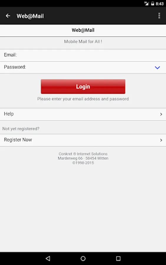 This app provides a cloud based interface for all using a unique public email-address (Domain like yourname.com NOT for Mass-Mail like Gmail, Hotmail, Yahoo etc) It provides an universal cloud based Mail-Service hosted in Germany. Roundcube or Horde are not needed.
