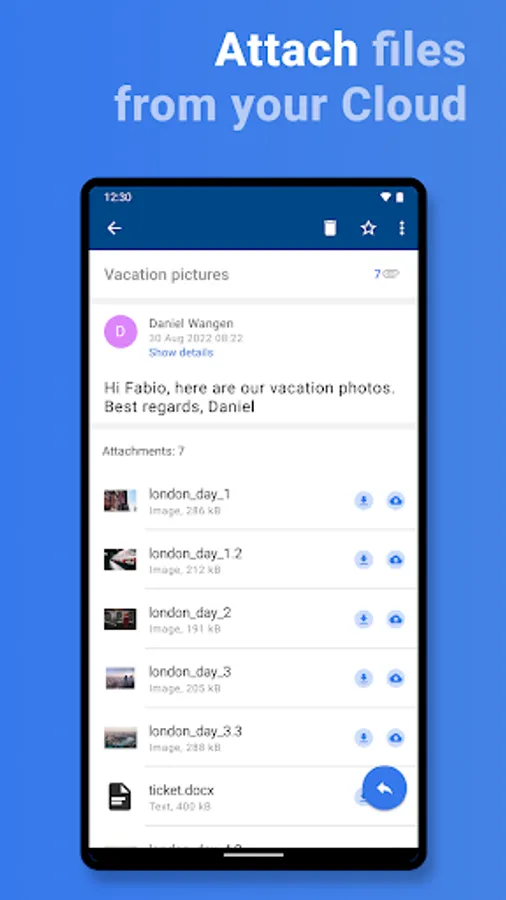 Our secure mail.com mail app lets you access the free mail.com Cloud right in your mailbox, for secure online storage of photos, videos and documents. With cloud mail you can access all stored files online on your smartphone and upload items directly from phone to cloud. An automatic upload function can be activated to back up photos to your secure cloud and access in your webmail.