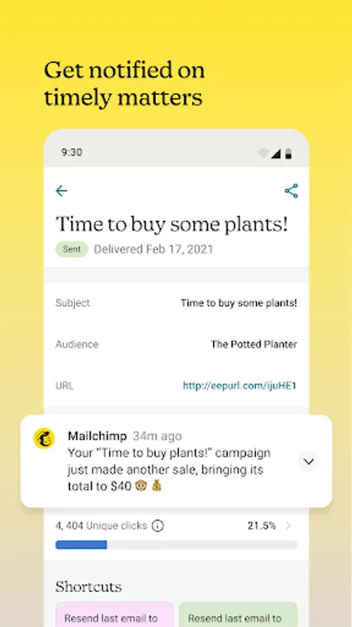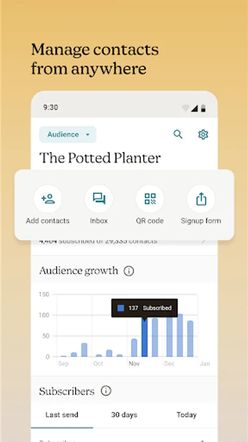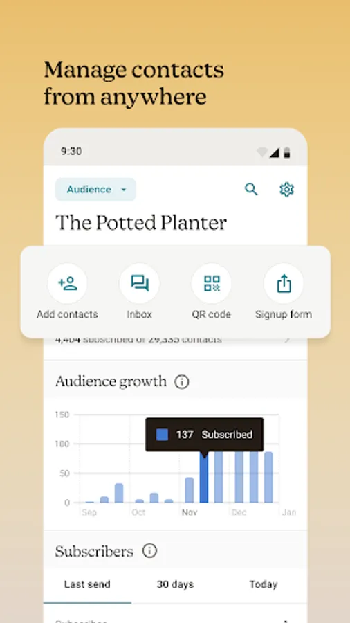 📞Marketing CRM - Keep up with your contacts with Marketing CRM from Mailchimp. Find and add new customers with contact import tools, such as the business card scanner. Track audience growth and view insights about individual contacts on the dashboard. Do it all in one place - call, text, and email directly from the app. Record notes and add tags after every interaction to remember the important details.