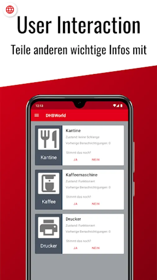 User interaction: Let me know what's going on at the DHBW. How full is the canteen, is the coffee machine broken again? Find out with this feature!
