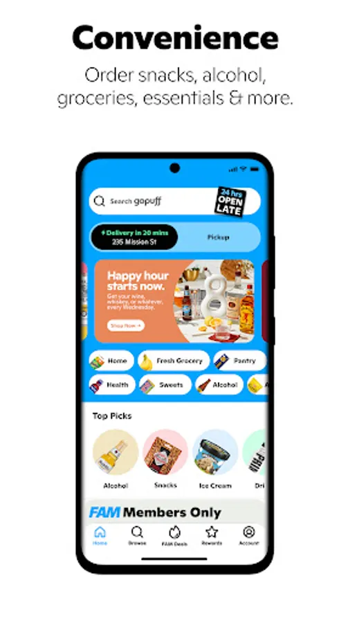 Gopuff Fam members pay $0 delivery fees on every order, any time of day. We offer monthly and annual subscriptions.