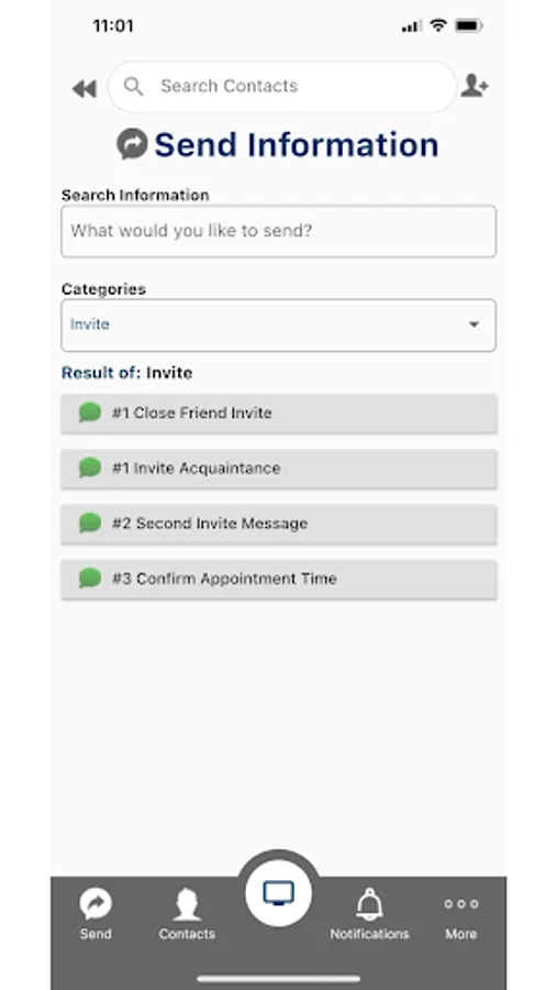 -Easily send approaches or presentations to your contacts with simple pre-written invite scripts over text message or any messenger service