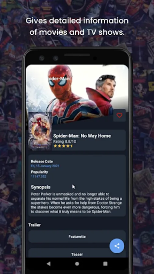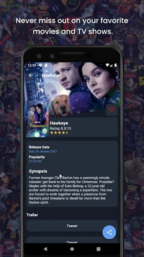 Bell Watch is a very easy to use mobile application to send notifications with newest and latest wide range of movies and TV shows. It provides lists of movies and TV shows with various features such as title, release date, trailers, and details include ratings, popularity, and synopsis. It is safe to use and the information provided is reliable. It also allow users to mark favorite movies and TV shows and share the desirable movies and TV shows.