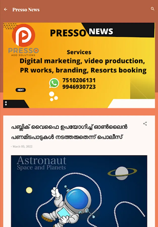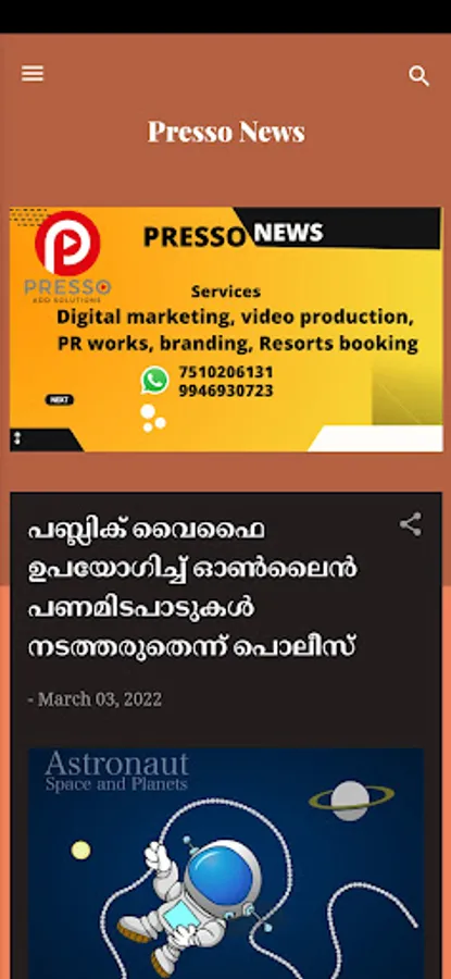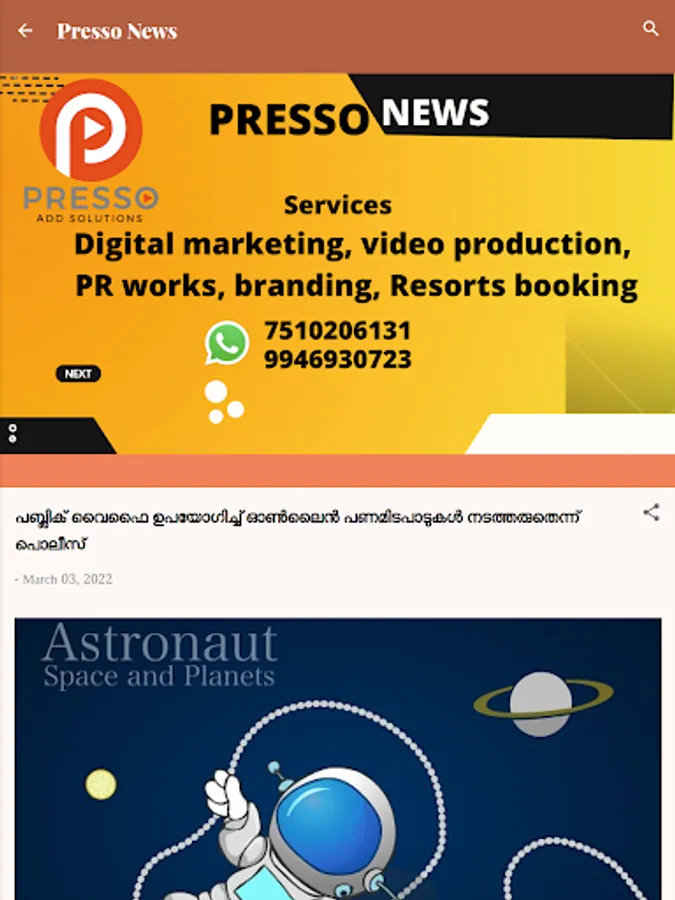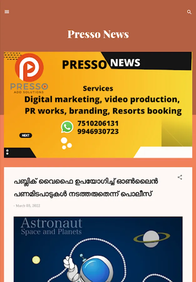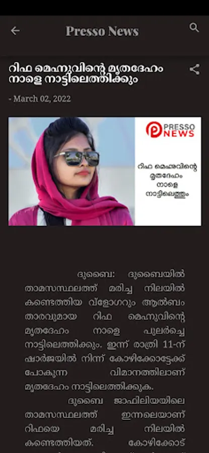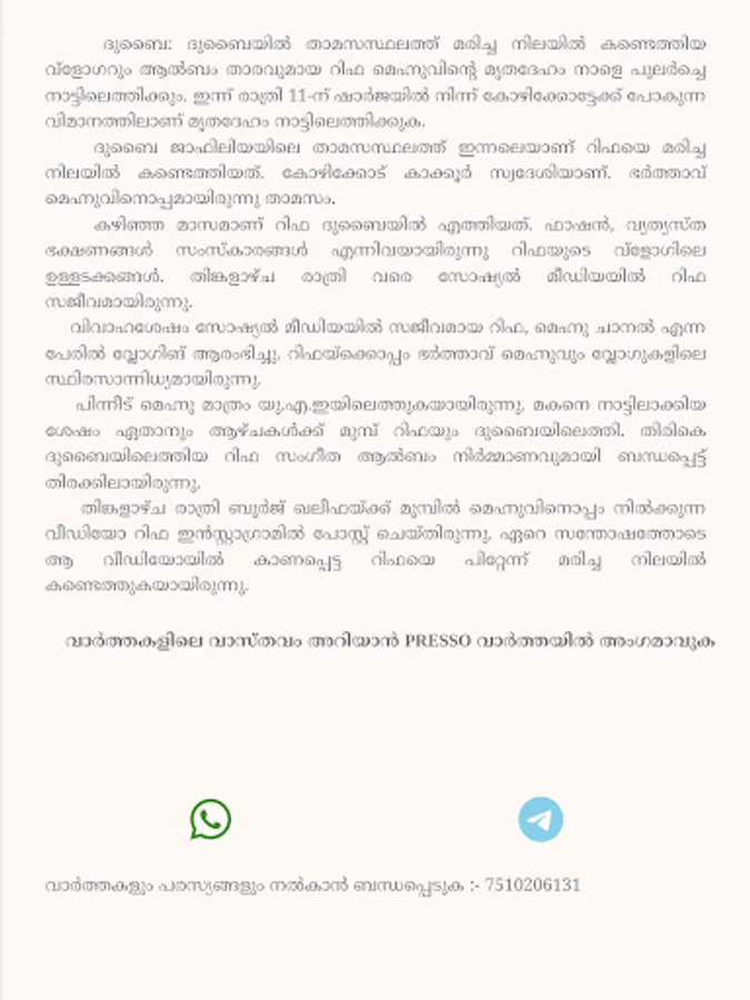 Presso News provides Latest Kerala News in Malayalam and English. Local News with Live News Coverage, Election News, Sports News, National and International News, Movie Reviews, Entertainment News, Lifestyle, Technology News, News Headlines of the Hour, Daily News Summary and coverage. Best Malayalam News App from the most trusted Malayalam Newspaper, Presso News (മലയാള മനോരമ).