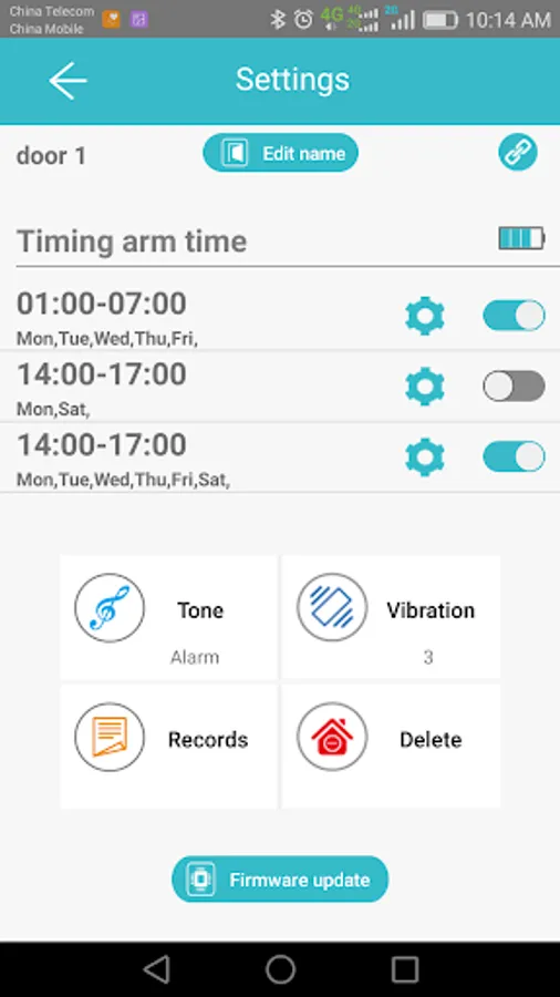 The APP is used to control Bluetooth intelligent audible visual magnetic alarm with the functions like Arm, Timing Arm, Disarm and records-checking etc .This alarm is a combination of Bluetooth, magnetic and Triaxial Accelerometer Sensor .When in Arm status, opening the door / window or vibration will trigger the alarm, tap APP can implement all the functions or update the latest versions of firmware on APP to have better experience.