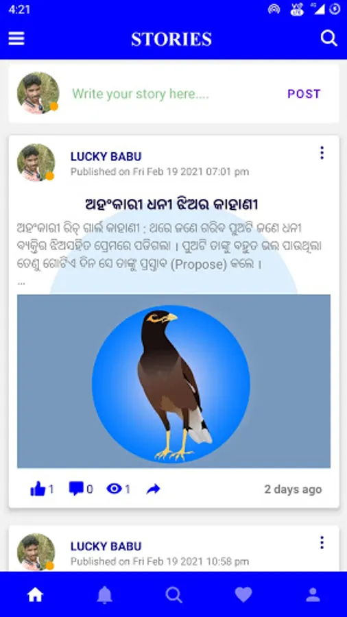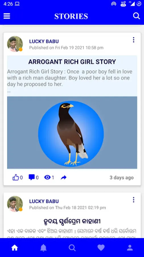 Maina is the real story app for the public. Where they can read and post a story. There are all types of stories available. Like Love, Sad, Motivational, Inspirational, Comical, funniest, etc...