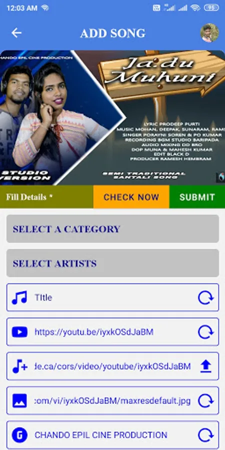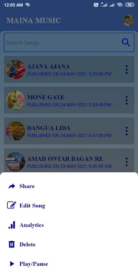 This app is a part of Maina Music. You can upload own santali song and earn money. There are many options available like report and copyright strike. Creator can't upload other's songs.