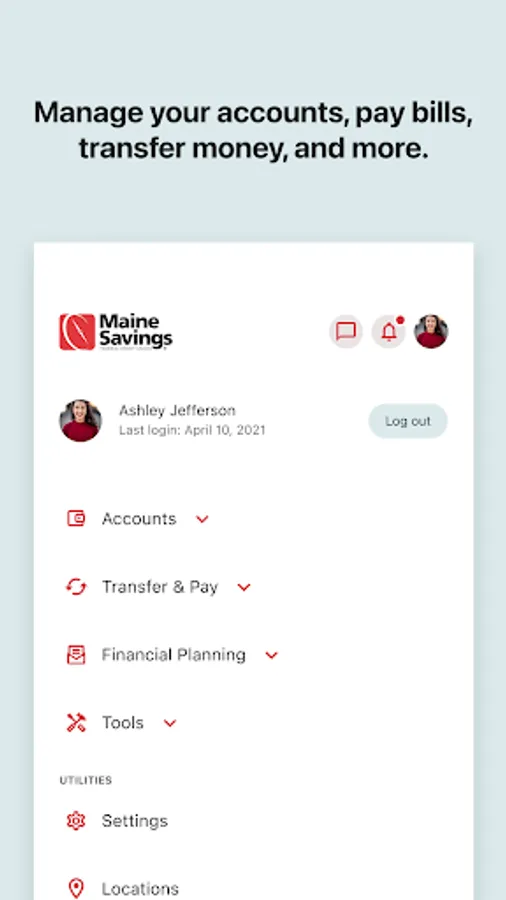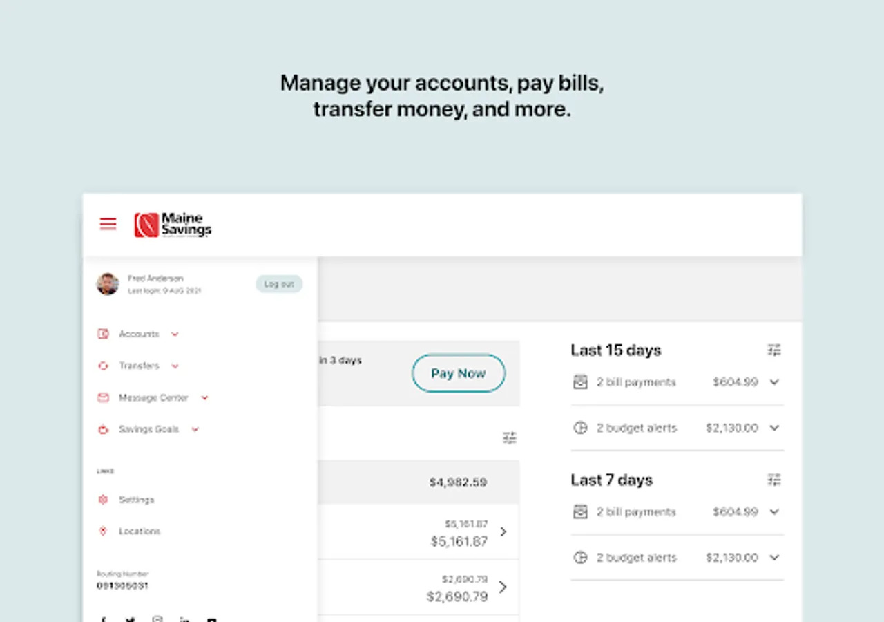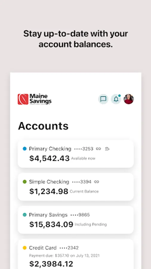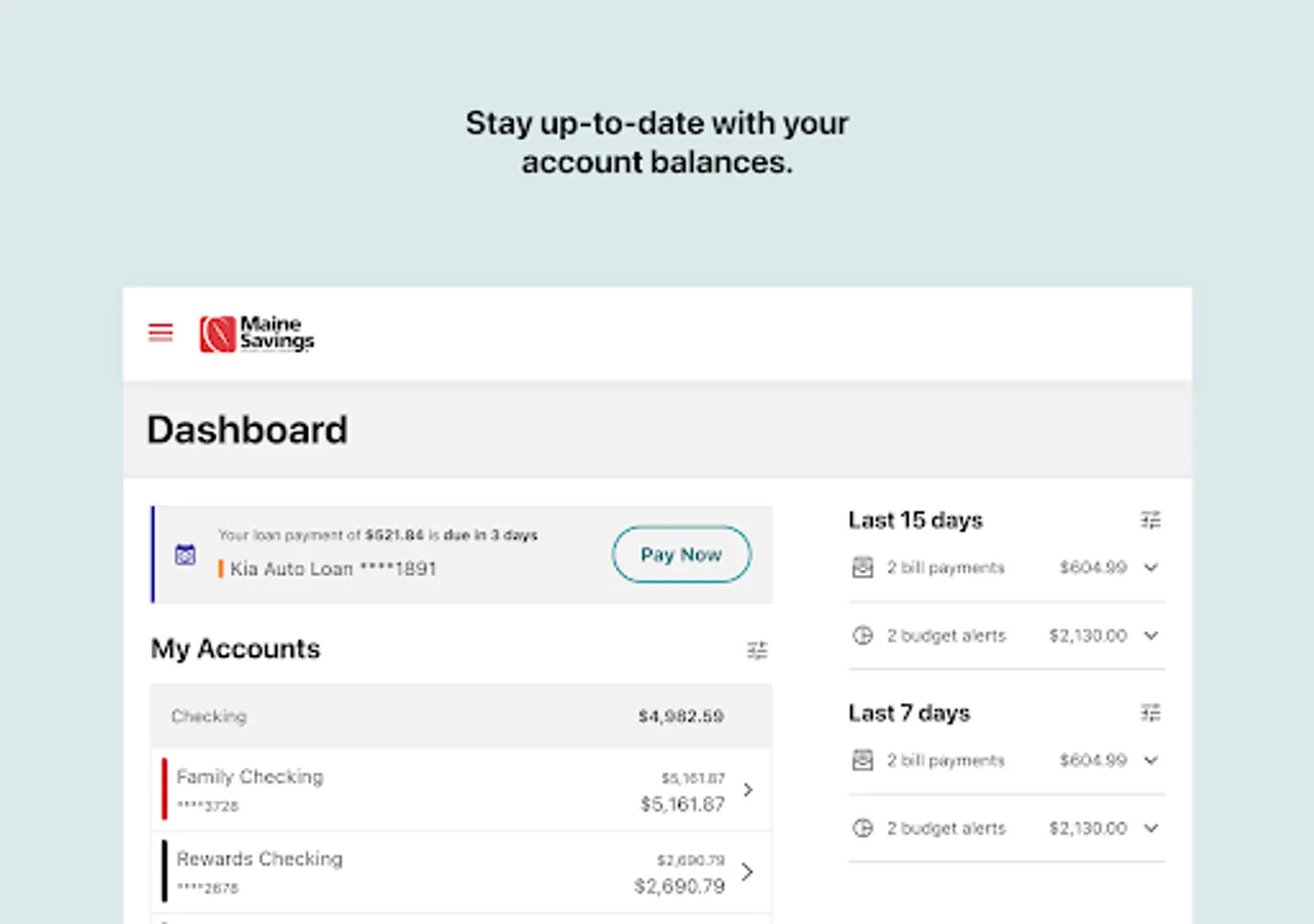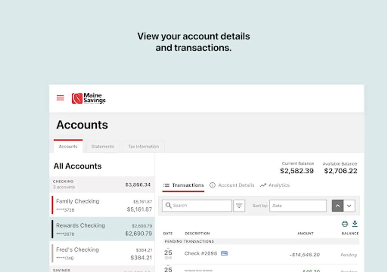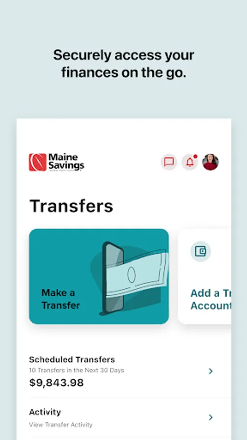 Maine Savings Digital Banking allows you to check balances, view transaction history, transfer funds, deposit checks, pay loans, manage business accounts and much more.