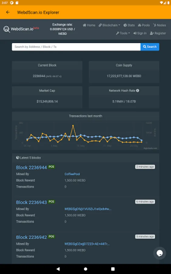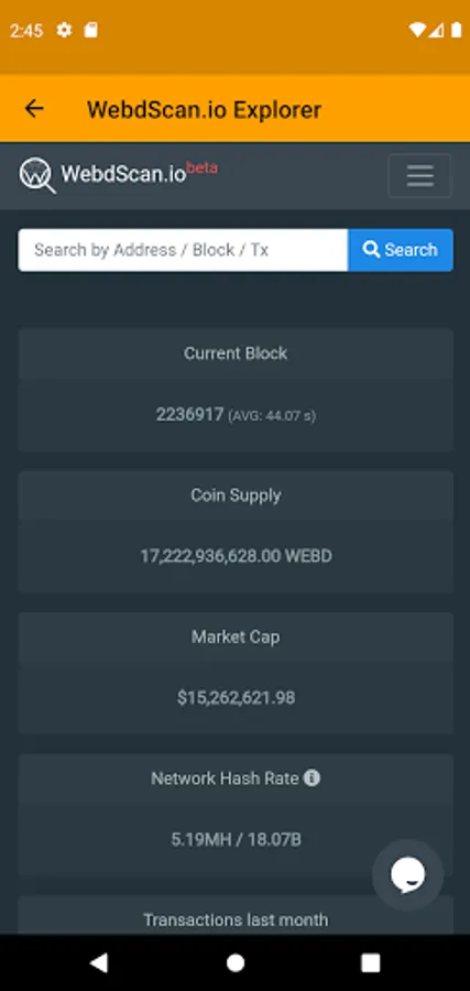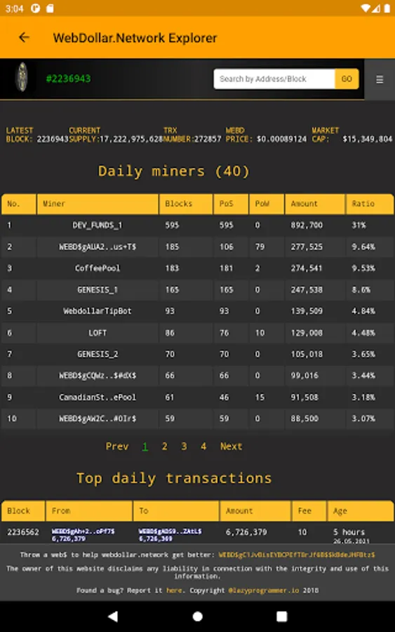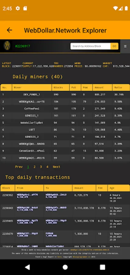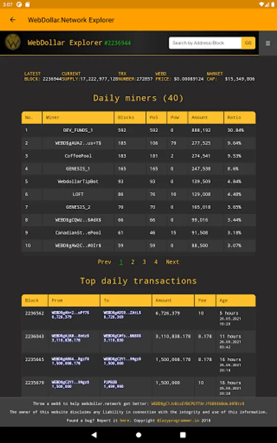 ⚓️ WebDollar Explorer was created to easily Explore the WebDollar Eco System - join the forum, manage your wallets, create payments, send - receive webd's, check your wallet balance, see sent and received transactions, mined blocks, pool statistics, addresses and a lot more.