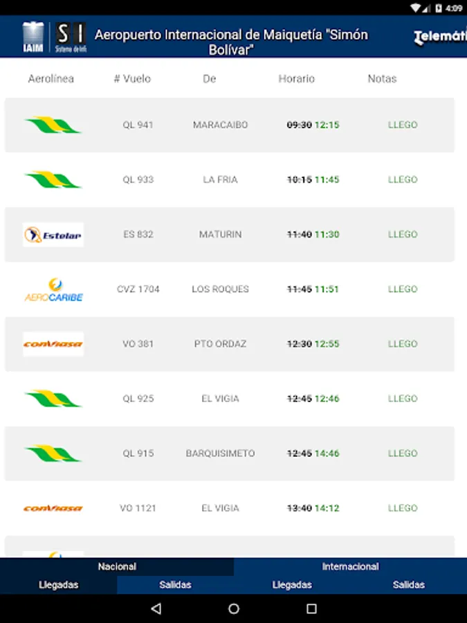This application allows you to view arrivals and departures of flights easily and conveniently. The information is provided through the Flight Information System of the International Airport of Maiquetía "Simón Bolívar".