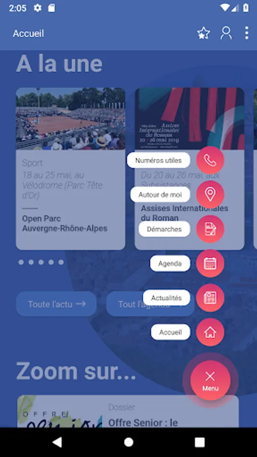 - news, agenda, zoom on, around me, steps, personal space (tracking my requests), my favorites, my preferences and useful numbers.