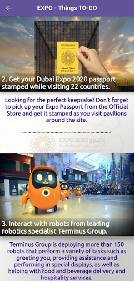 - This app shows you about 50 best things To-Do at EXPO 2020.