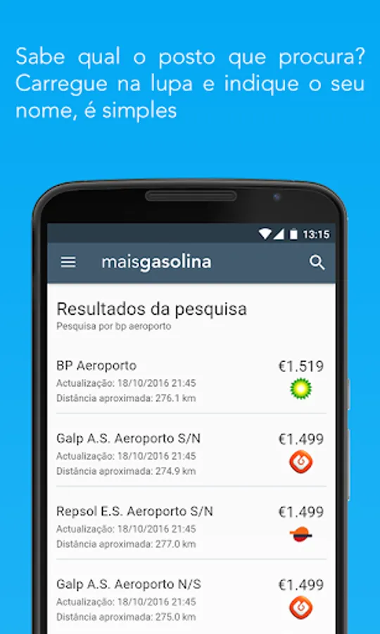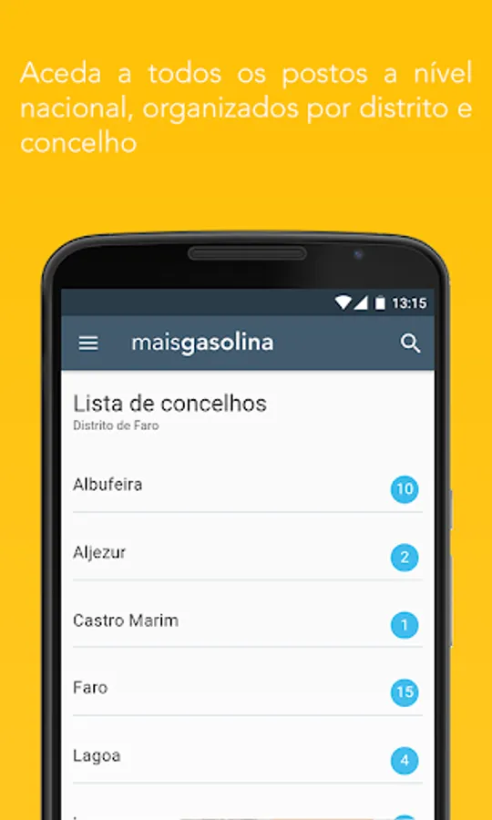 • Lista com todos os postos disponíveis no Mais Gasolina de Portugal Continental