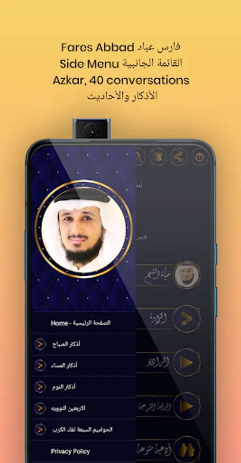 5- In the side Menu you will find Morning Azkar, Evening Azkar, Sleep Azkar, 40 converstions, and much more to be added for Fares Abbad فارس عباد