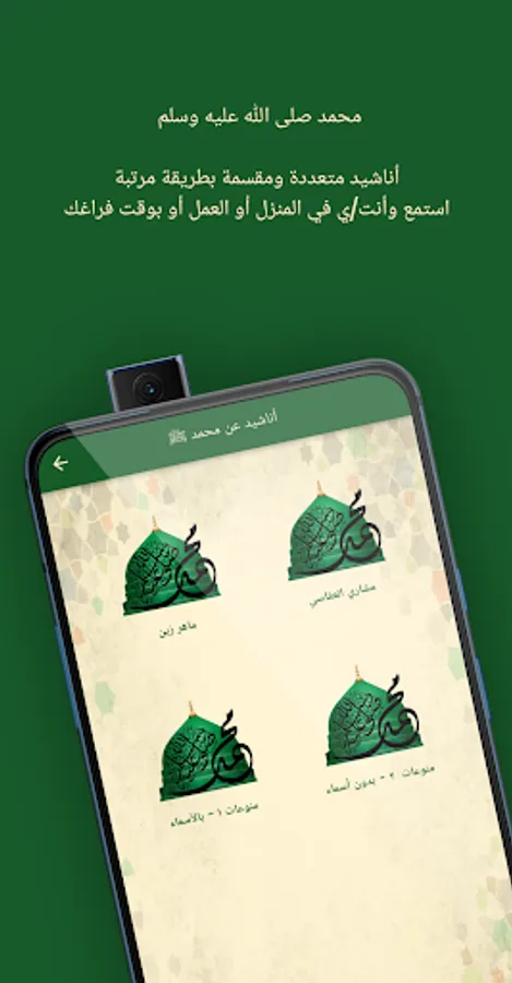 A lot of the Arabic Anasheed inside the application are about praise and love for Muhammad peace be upon him محمد صلى الله عليه وسلم
