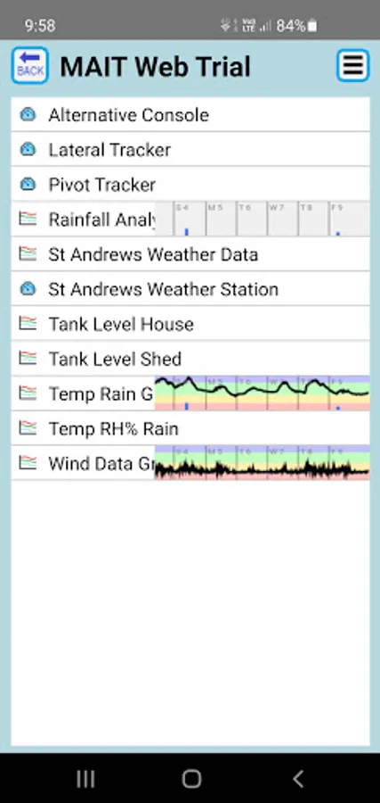 Access and view data from your MAIT iNTELLiTROL cloud enabled field units and/or your MAIT iNTELLiTROL base station(s). Monitor soil moisture probes, tank levels, weather stations, pivot/linear positions and states, pump pressures/flows and more. Data is presented in graphs and collections of gauges in consoles. Multi user access means multiple personal can access the same information at the same time. User access levels can be setup from guests, to view chosen data only, through to admin users, with full access to your network(s).