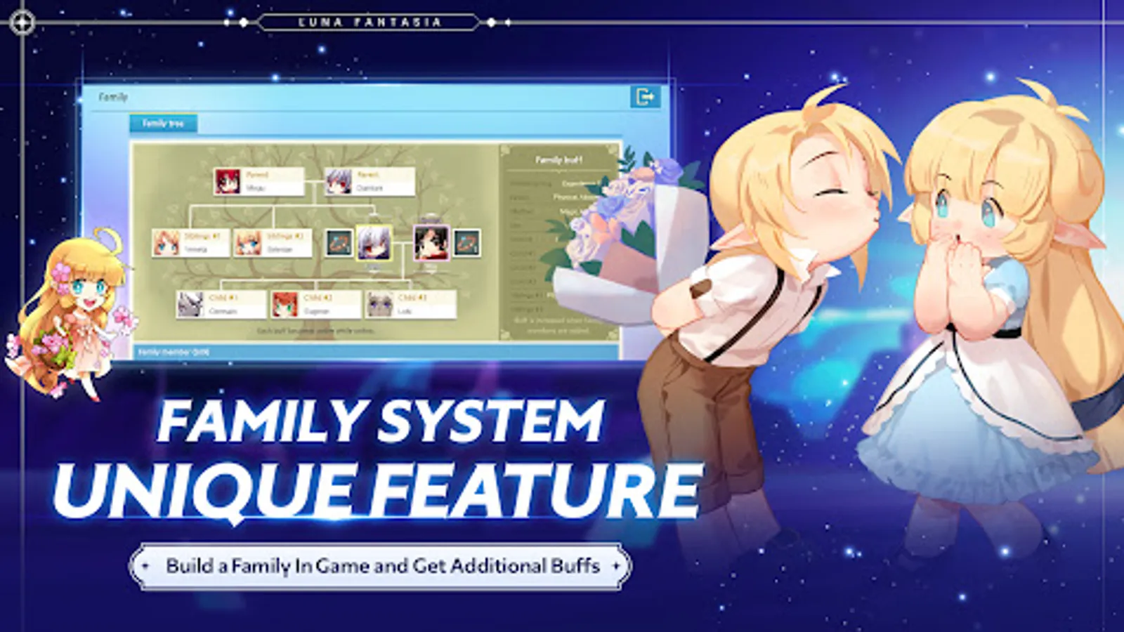 Find a partner, adopt children and build your own family at Luna Fantasia Mobile! With the excellent Wedding and Family Tree features, you can create a virtual family that will provide extra buffs when playing together.