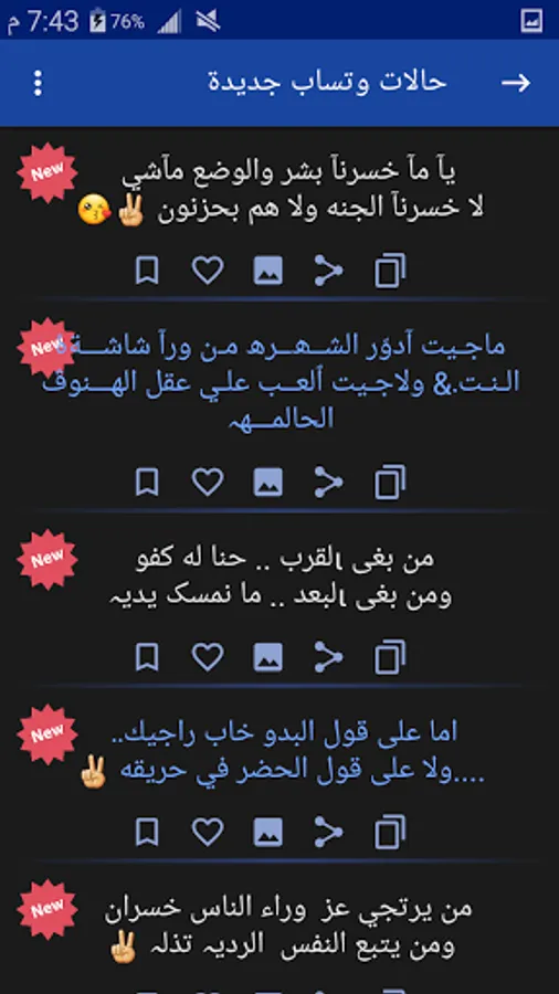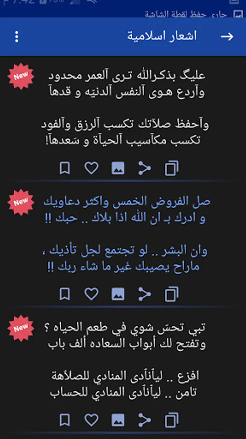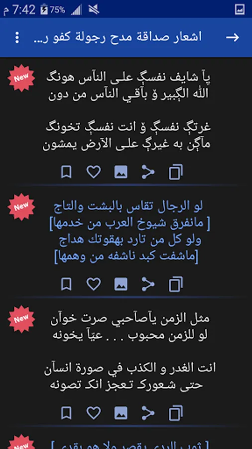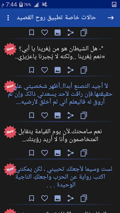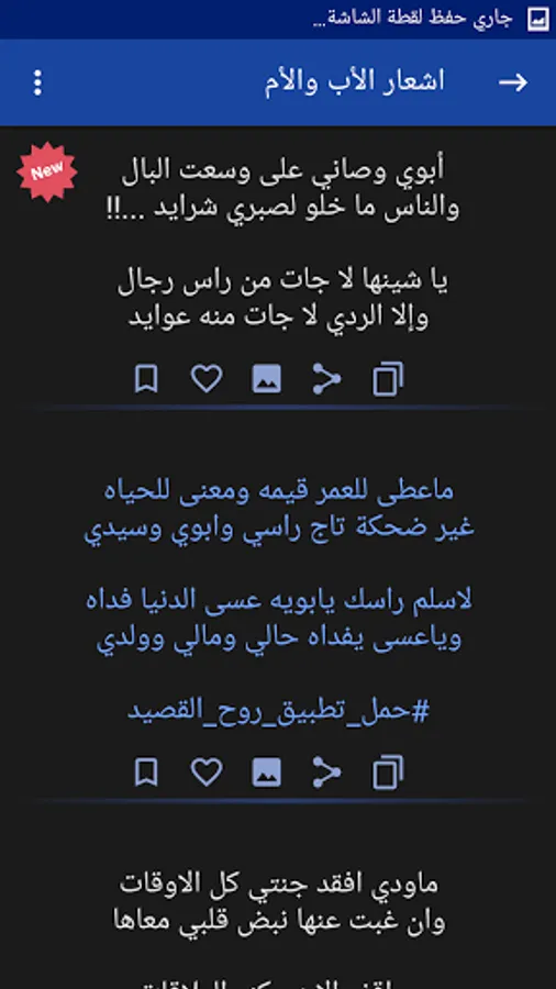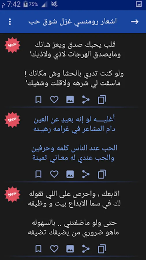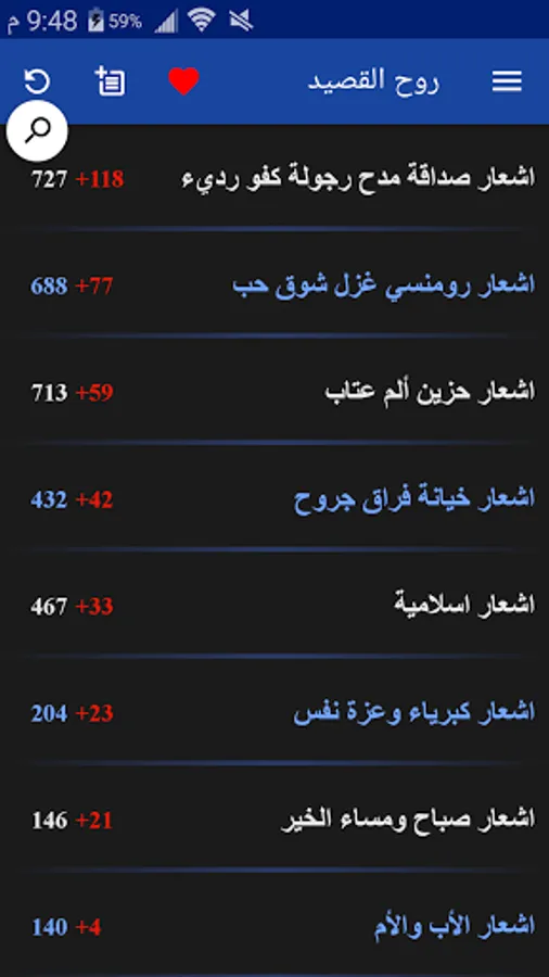 - Sections within the application are "Notice of longing, romance and spinning, evening and morning poems, Islamic religious poems, supplications to relieve hearts, notices of separation, betrayal and wounds, poems of sadness, reproach and pain, poems of friendship and praise, poems of pride and pride of the soul, poems of Eid al-Adha and al-Fitr and congratulations and Christmas, poems From the father and the mother, new cases of WhatsApp,