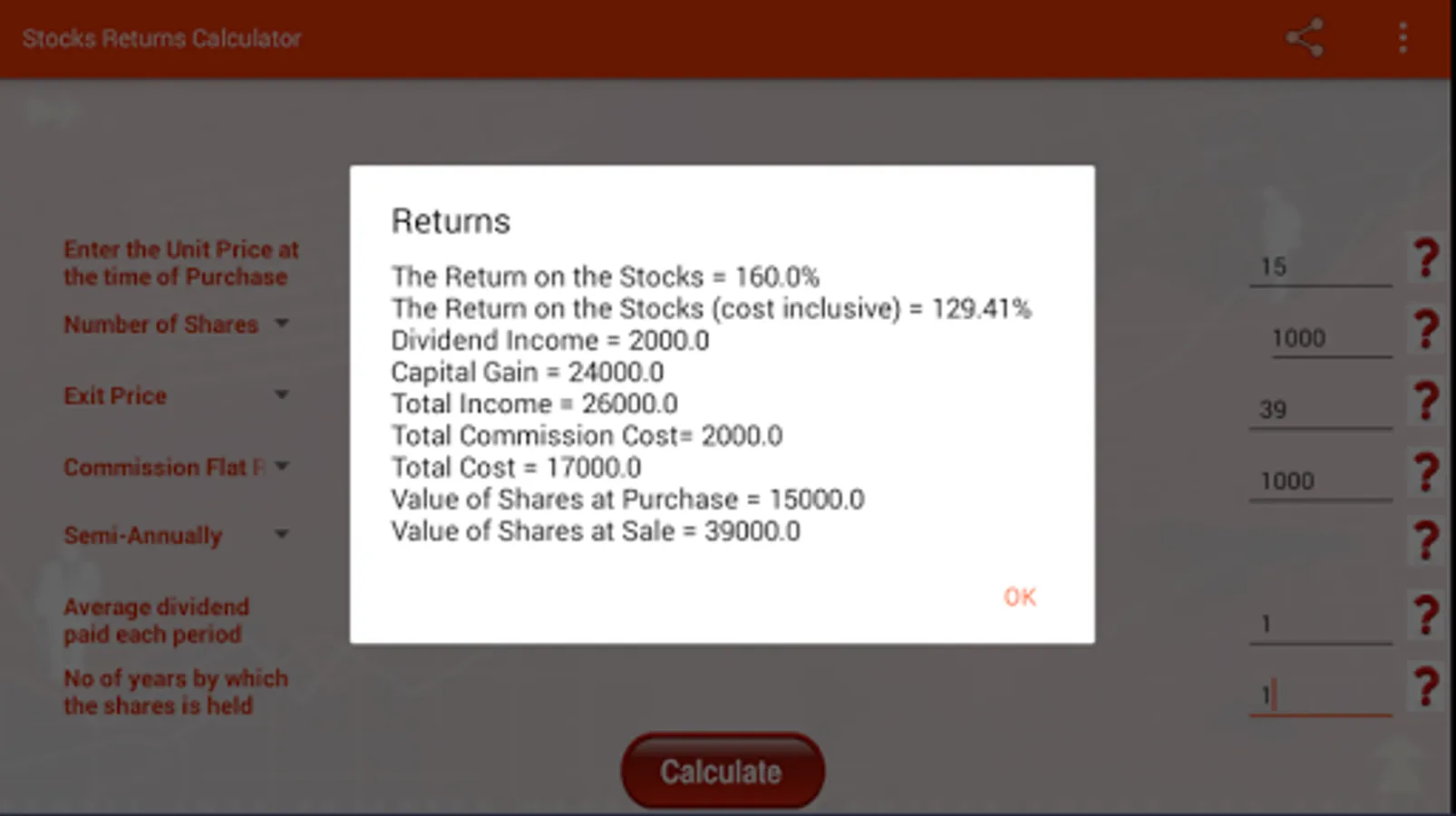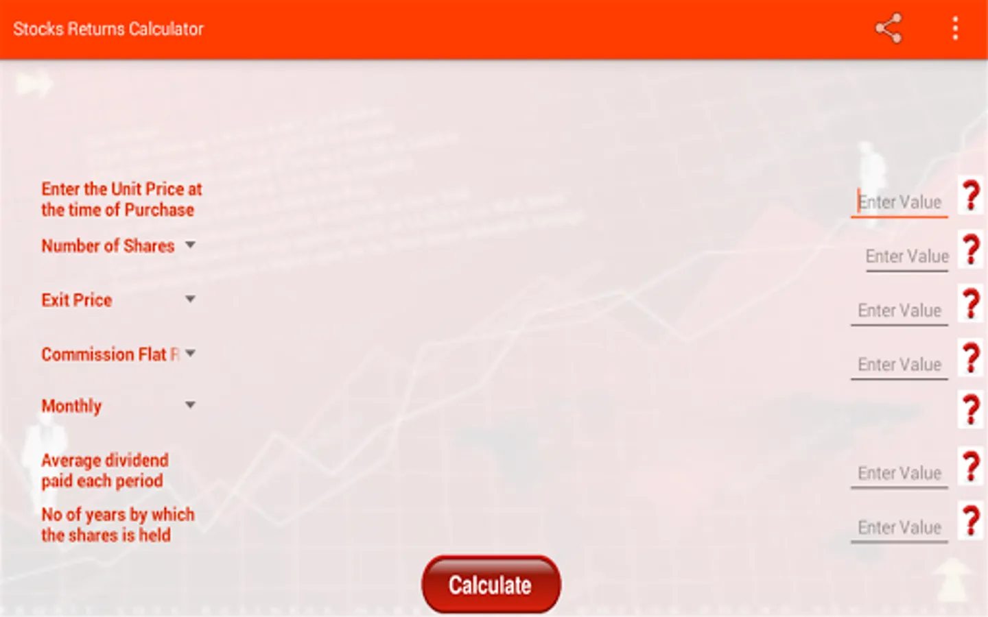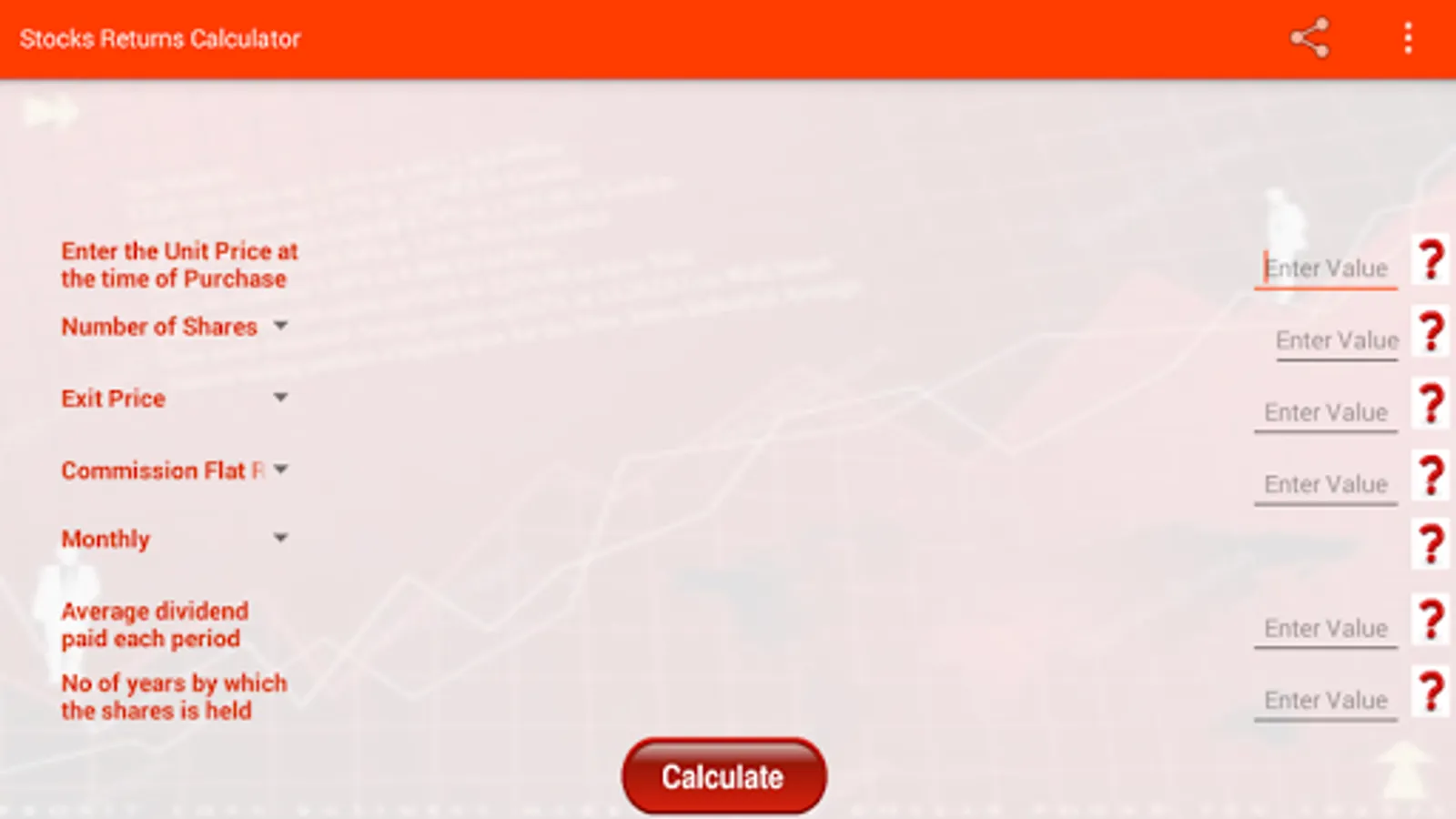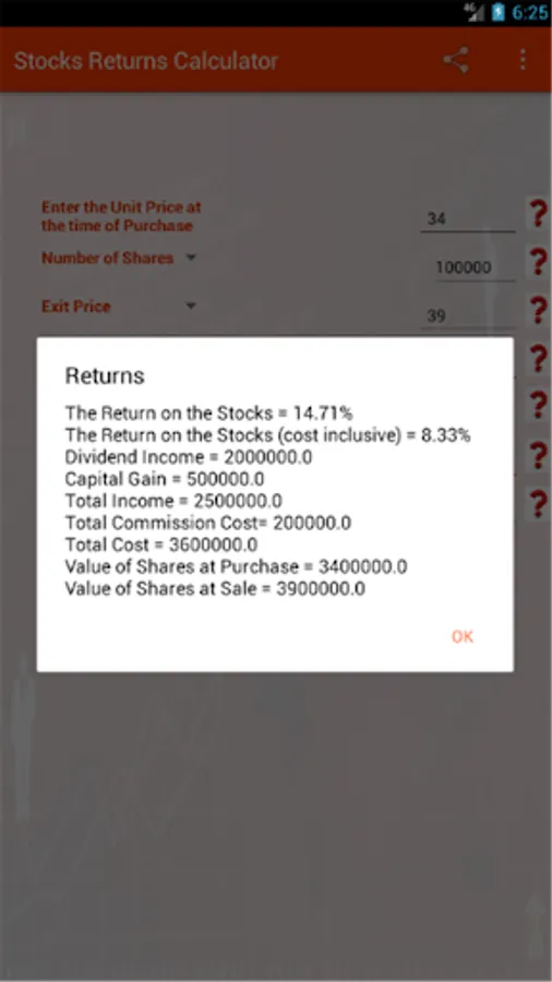 This app is a return calculator for stocks, exchange traded funds(ETF), mutual funds etc that will help you anticipate and plan your investment based on percentage return, commissions, dividends, price and holding period of the stocks.