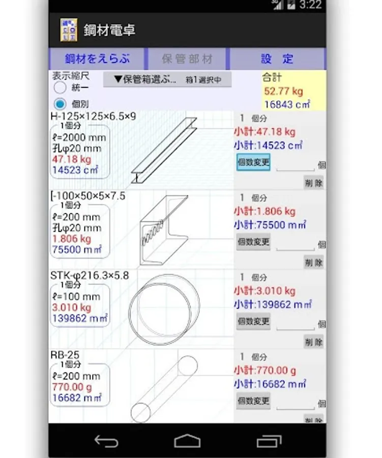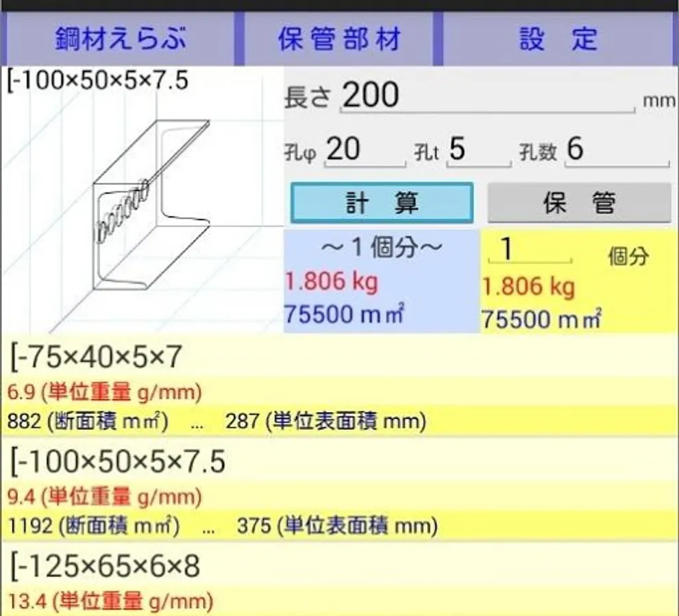 ★長さ等のサイズ入力により、鋼材個別の 質量、表面積 を表示します。