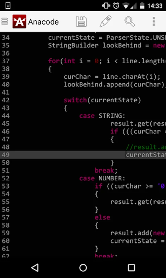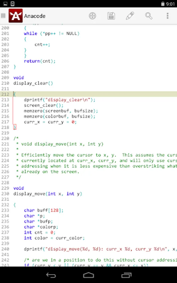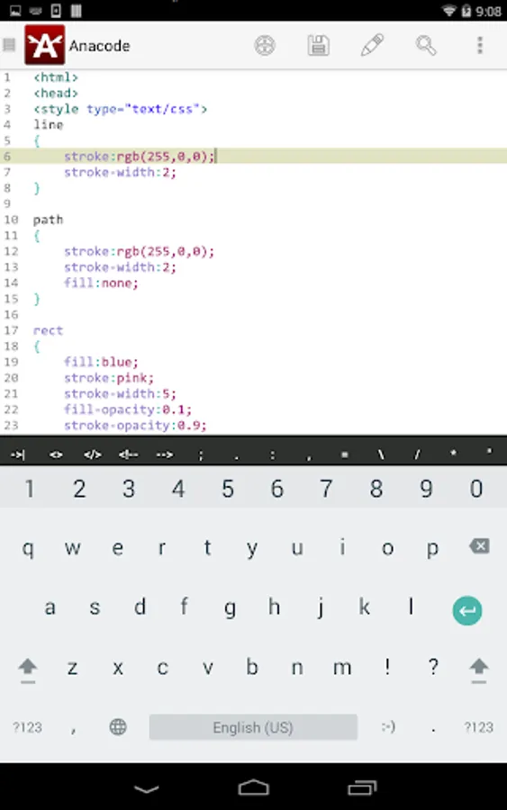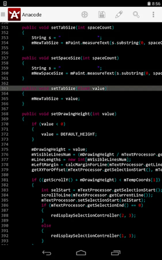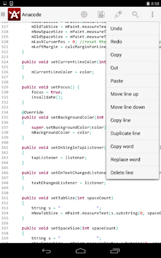 Anacode introduces a new code edit model for smart devices allowing for faster and much easier writing and editing of source code then ever before. Copying, pasting, deleting (and other functions that are used a lot during coding) of lines, words or selections of code is a single tap/click away and speeds up your coding time dramatically.