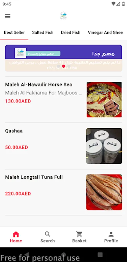 An application for selling salted and dried fish, ghee and lemon vinegar.