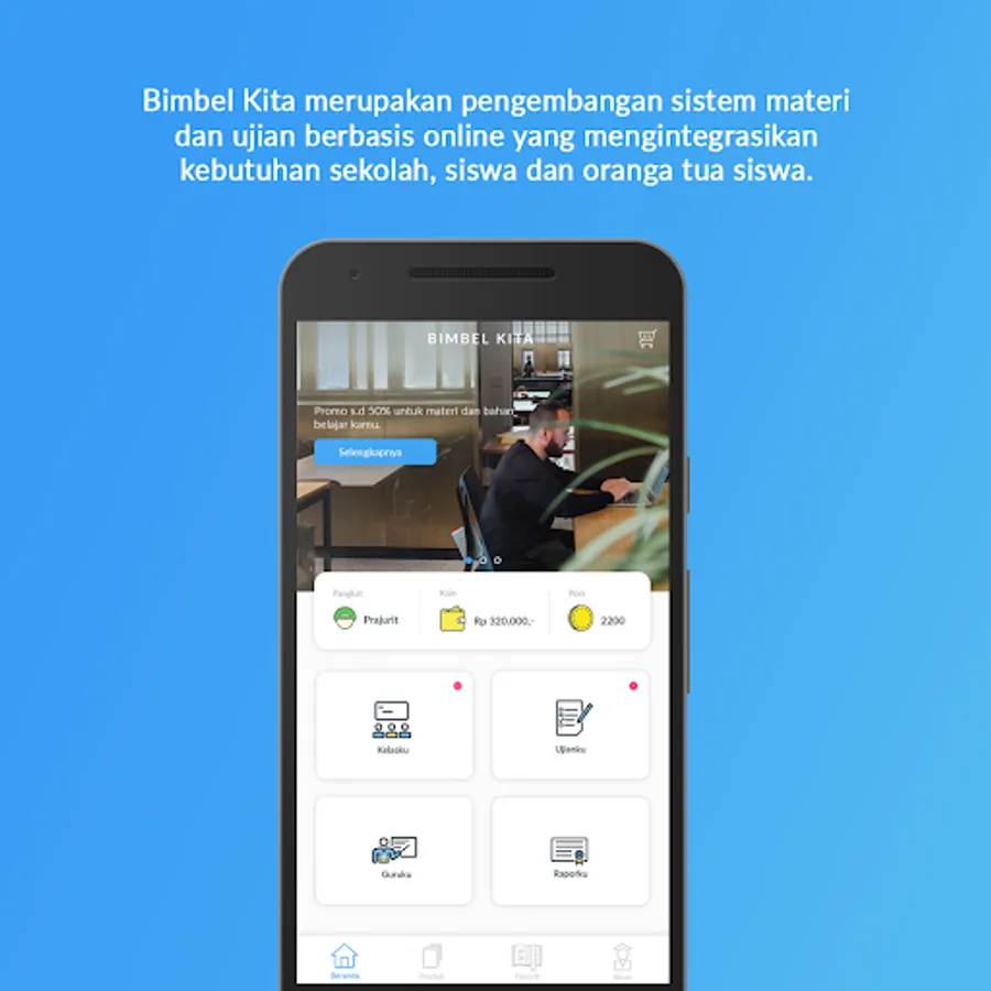 BIMBELKITA bikin belajarmu kini makin mudah dan asyik! Yuk rame-rame dengan temanmu ikut kelas, bertanya dan berkonsultasi dengan guru-gurumu, dan juga mengikuti ujian secara online: apapun, kapanpun, dan dimanapun.