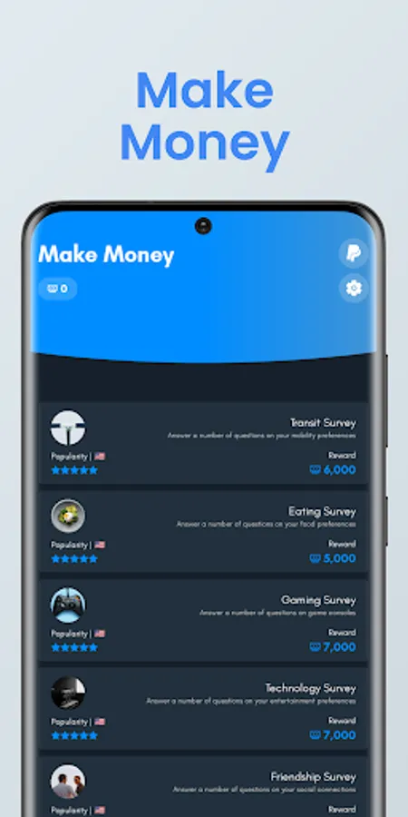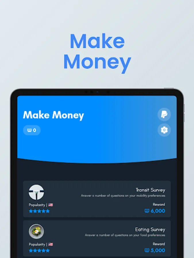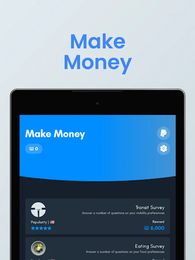 Everyone can make money and get cash rewards. All you need it a smartphone and internet connection. Start your paid surveys. Launch your reward games. Test your new products. Get credits in the app, collect points, request payout and get paid. Get cash directly on your PayPal.