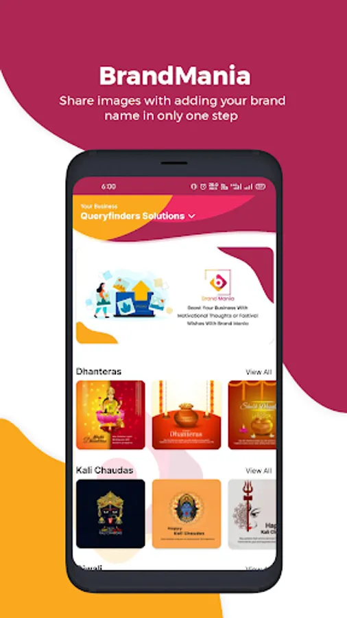 Brand Mania is an application to make image on your own by adding business frame and sharing images, Brand Mania contains images of different featured categories of images like business motivational, team building, festival images, daily greetings, great people motivational quotes etc.