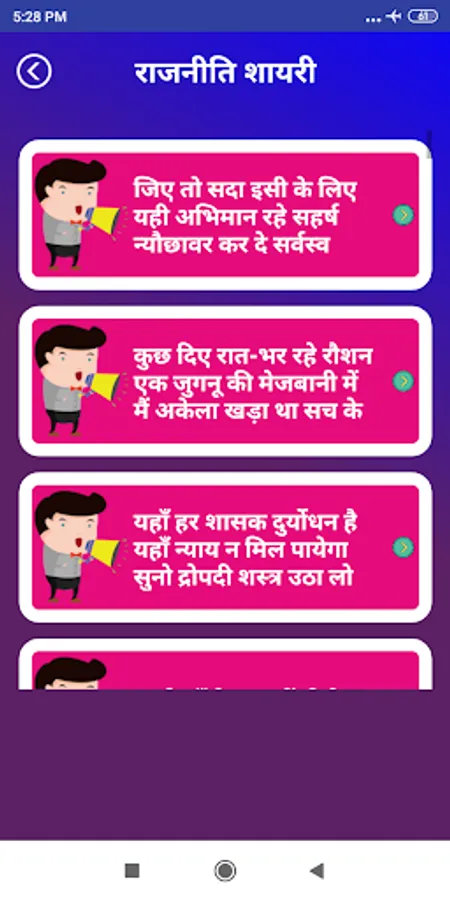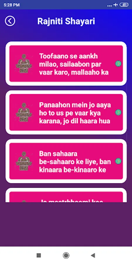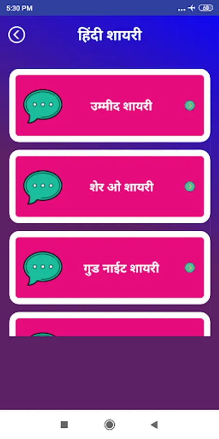 This is simple Hindi Shayari app for entertainment. This app developed for entertainment purpose of indian users. This app does not represent the government entity or any government services.
