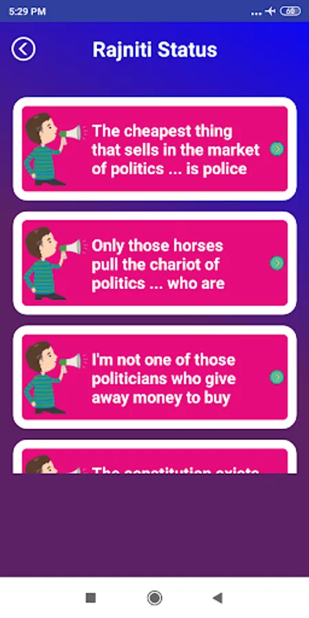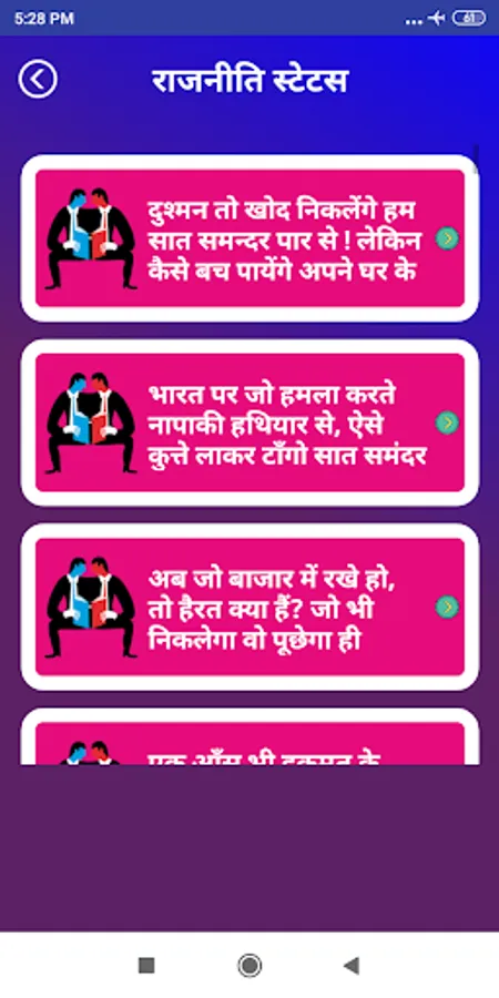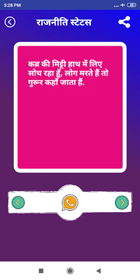 This app contains largest collection of hindi Politics Shayari, Election Status, Vande Mataram & Patriotic shayari Status.