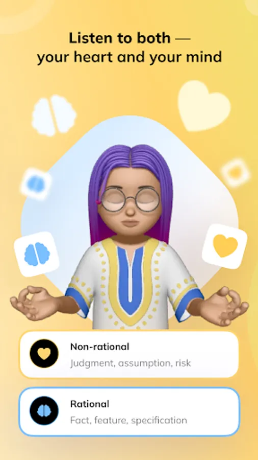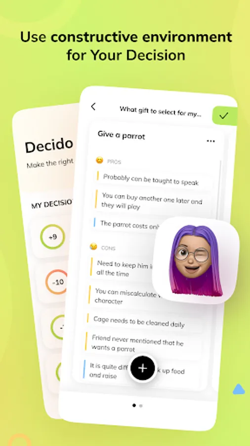 Every day we make a thousand decisions, and we have to make a choice. Sometimes the decisions - ordering tacos 🌮 or pizza 🍕, the choice is more significant - buy a new car 🚗 or still use subway, sometimes we face global questions: to connect life with a person, to determine the business of life. The more serious the choice and the more it affects our lives. Arguments pros and cons are mixed with emotions and our doubts, decide now or later, the opinions of friends and relatives. And in a situation of emotional fatigue, just the wrong decisions are made. At the same time, this is a big load for the brain. That is why our application will help you make a balanced and right choice that is right for you!