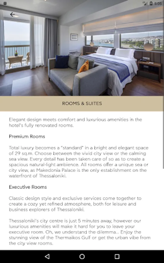 What makes a luxury hotel stand out? Makedonia Palace Hotel, Thessaloniki’s landmark hotel, offers 276 rooms and suites and redefines the meaning of luxury stay, thanks to its strategic position and its guest centered philosophy.