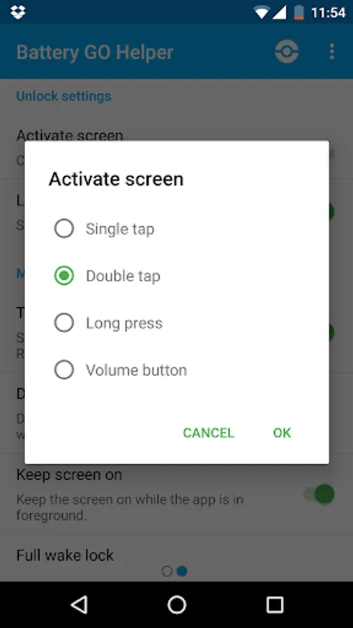 For Amoled screen's devices, this means close to zero battery drain while, in LCD screens, the lowest brightness will help a lot to save battery. For devices with Root access, we have a special option, to turn off the screen completely.