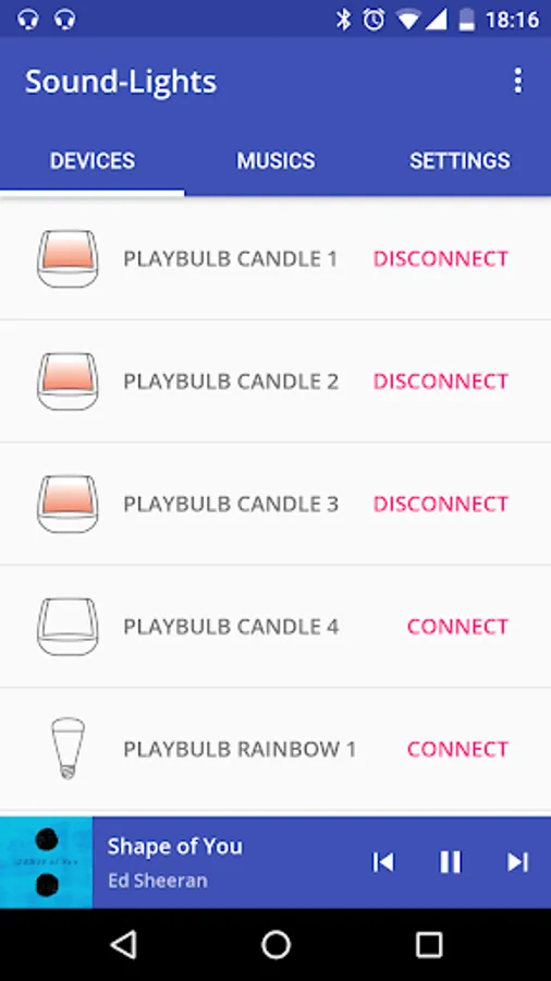 App allow you to create sound light show at home using PLAYBULB. All, what you need, it’s connect smart bulb by Bluetooth and choose music.