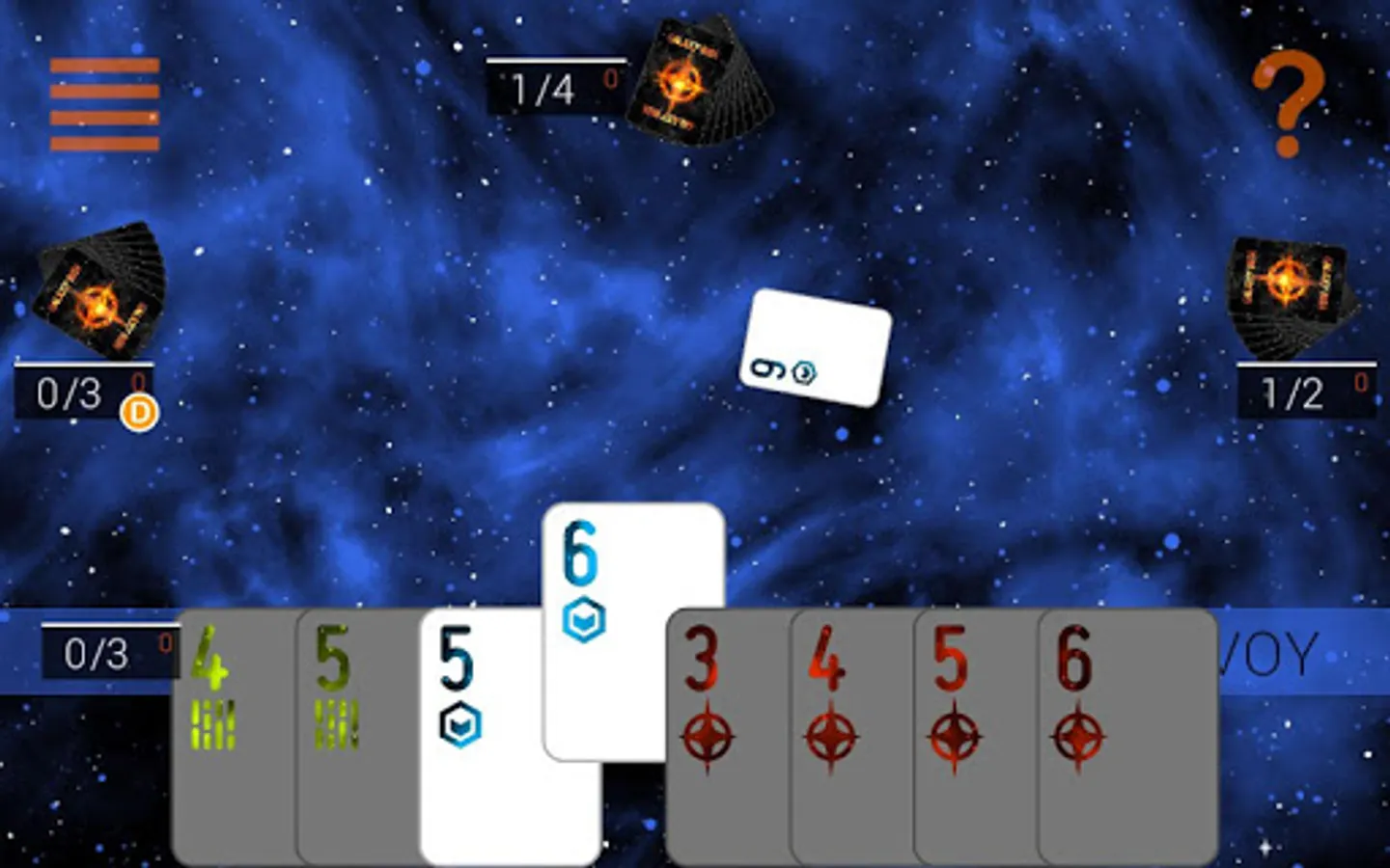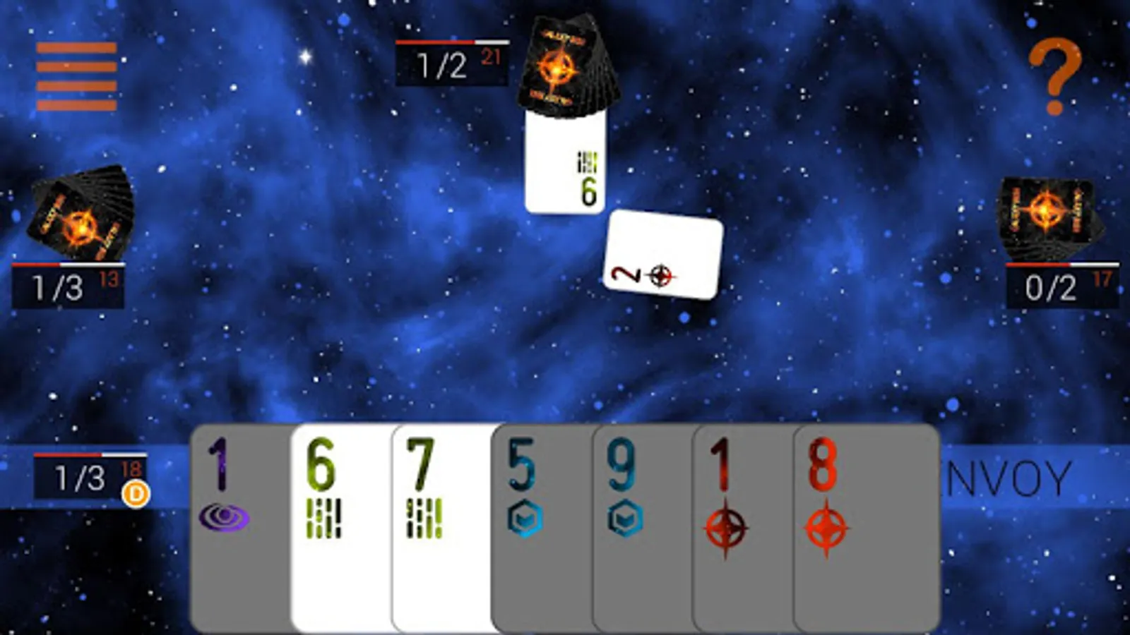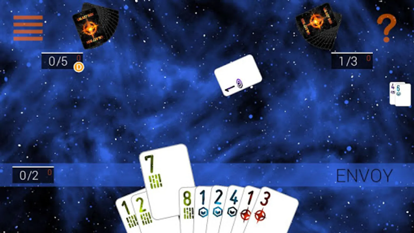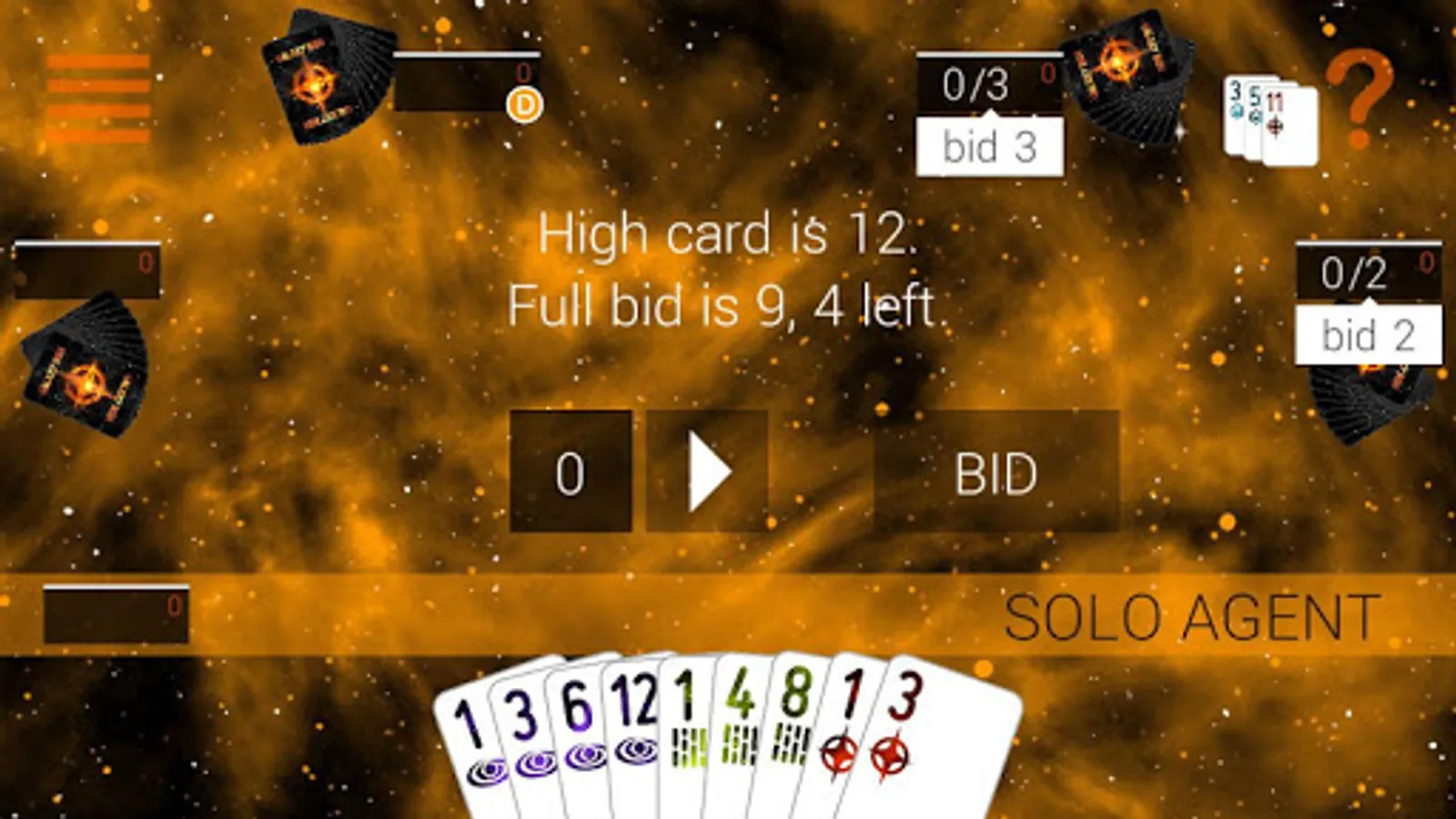The hand is played out in tricks. The Solar suit is always trump. As players take tricks they place their gems on the piles so the status of all bids is apparent to all. After the last trick is taken every player reveals their identity and scores points accordingly. Hands keep going until one player makes 30 points to win the game.
