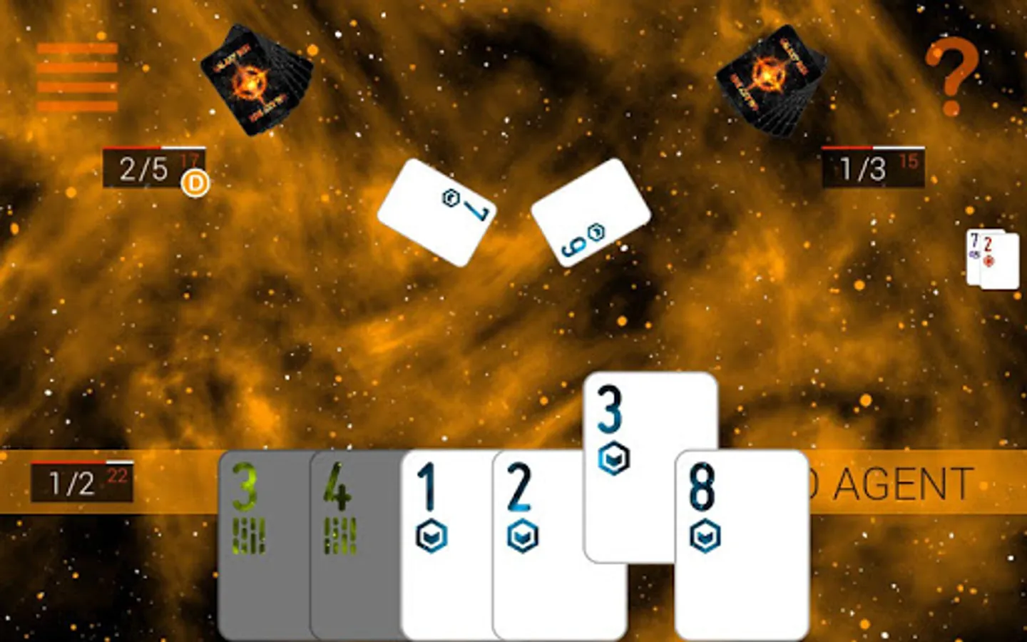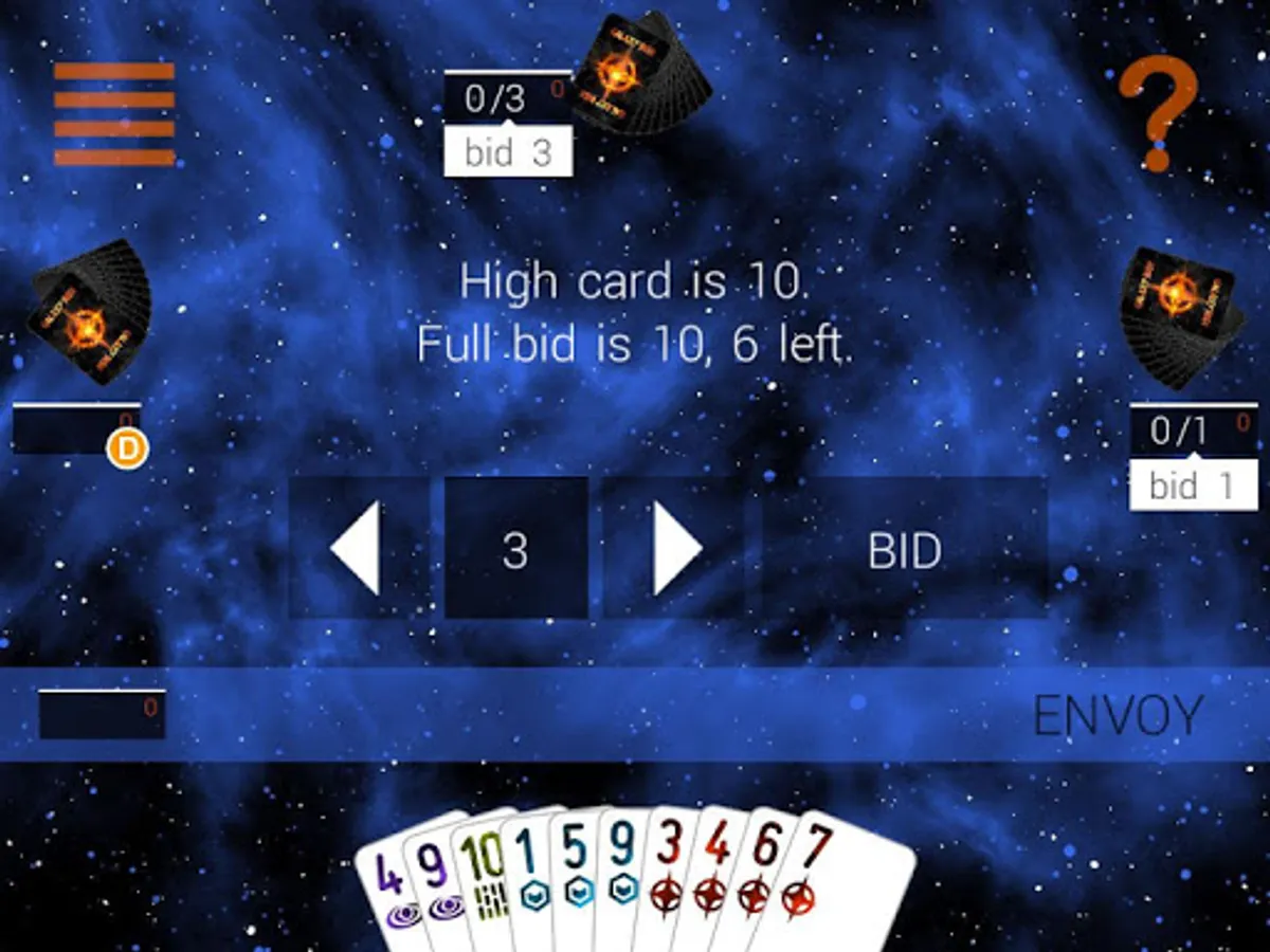 Players are given hidden identity cards: The "Envoy" scores points for other people making their bid, the "Saboteur" scores for others failing, and everybody else ("Solo Agents") score for making their own bid. The deck size changes depending on the player count (3, 4, or 5) so every game is balanced.